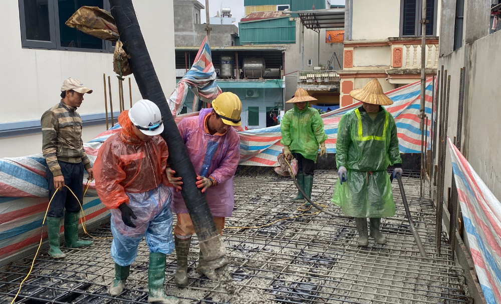 Quá trình đổ bê tông được thực hiện đồng bộ, liên tục theo đúng quy trình kỹ thuật, đảm bảo bê tông được phân bố đều tại các vị trí dầm, sàn, không xảy ra hiện tượng rỗ tổ ong hay phân tầng. Công tác đầm rung được kiểm soát chặt chẽ nhằm giúp bê tông đạt độ đặc chắc tối ưu, đồng thời đảm bảo bề mặt sàn phẳng, đúng cao độ thiết kế.