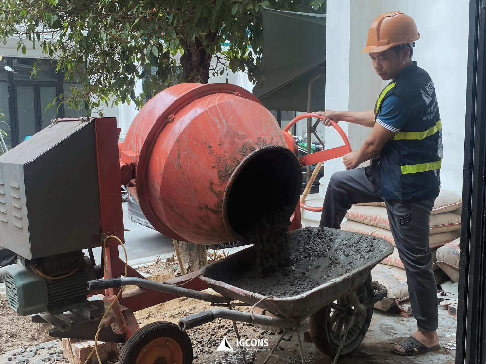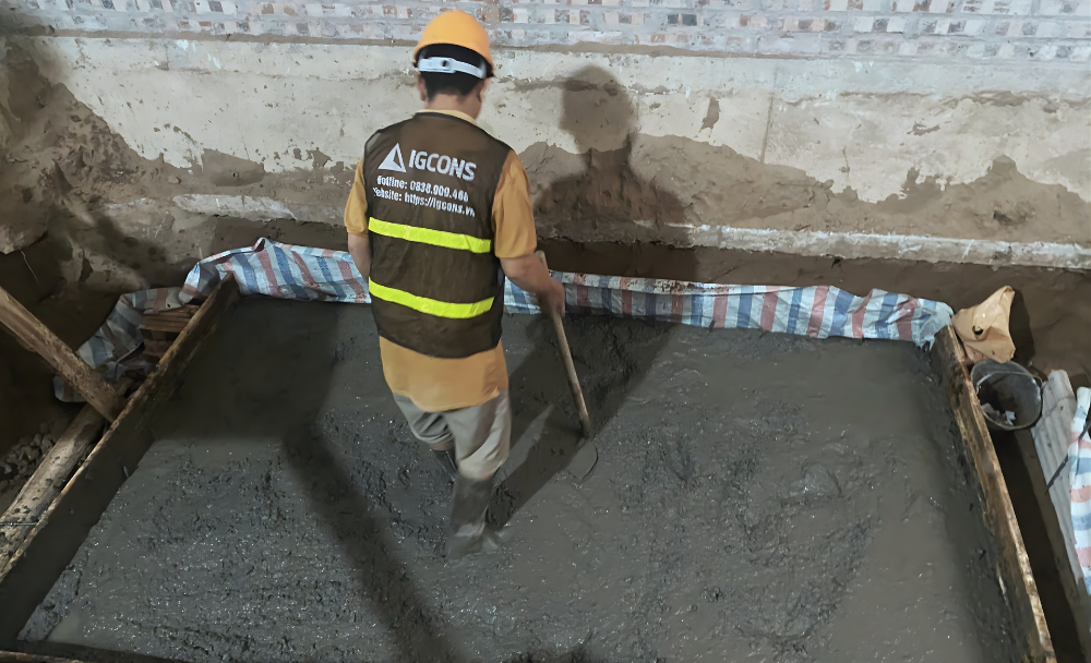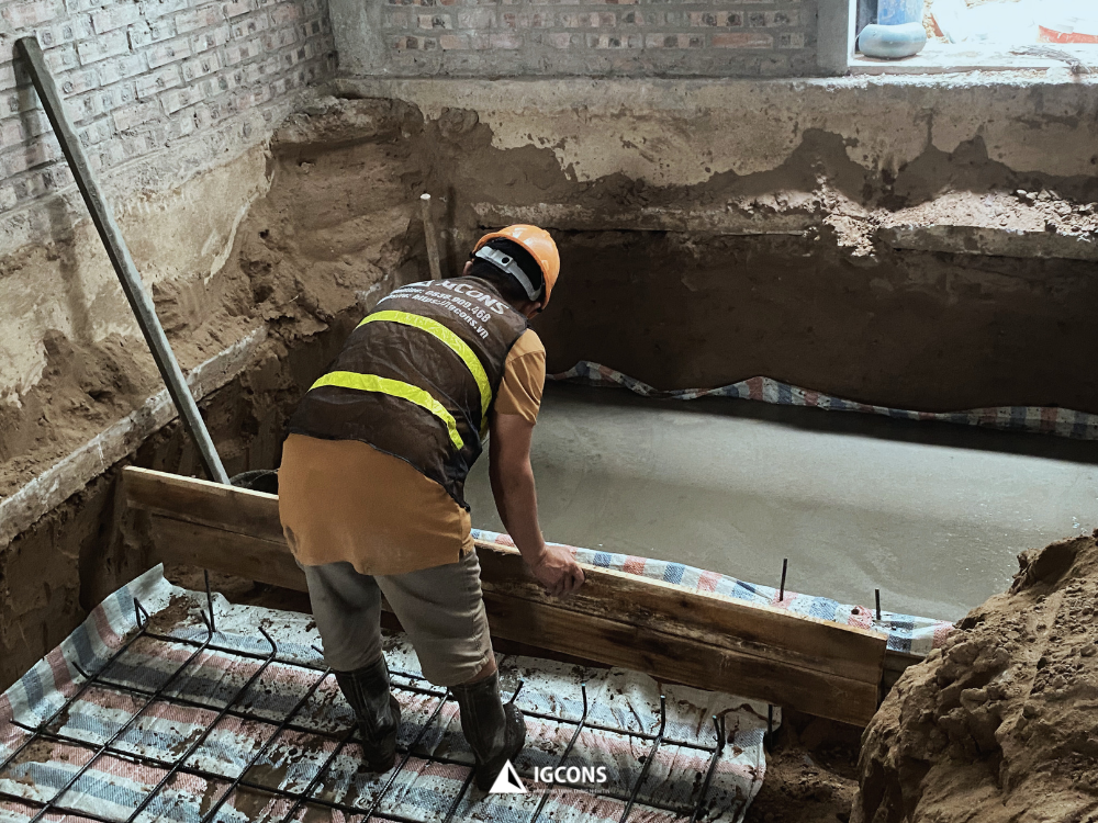 Tại dự án nhà anh Tùng thuộc khu đô thị Louis City – Hoàng Mai, sau khi hoàn tất công tác đào đất, gia công cốt thép và lắp dựng cốp pha theo đúng hồ sơ thiết kế, đội thi công IGCONS đã tiến hành đổ bê tông đáy bể nước và bể phốt – một hạng mục kỹ thuật quan trọng trong hệ thống hạ tầng của công trình.