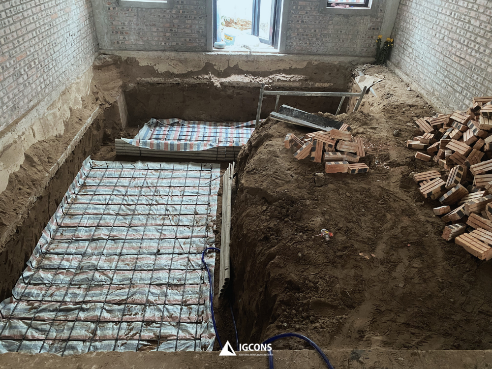 Công trình được xây dựng với quy mô 5 tầng, tổng diện tích sàn khoảng 500m², do đó hệ thống bể nước và bể phốt được thiết kế với dung tích phù hợp nhằm đáp ứng nhu cầu sinh hoạt lâu dài của gia đình. Trong quá trình thi công, đội ngũ kỹ sư và giám sát IGCONS đặc biệt chú trọng đến các yêu cầu kỹ thuật như độ dày lớp bê tông, khả năng chịu lực và giải pháp chống thấm nhằm đảm bảo độ bền vững cho hạng mục ngầm của công trình.