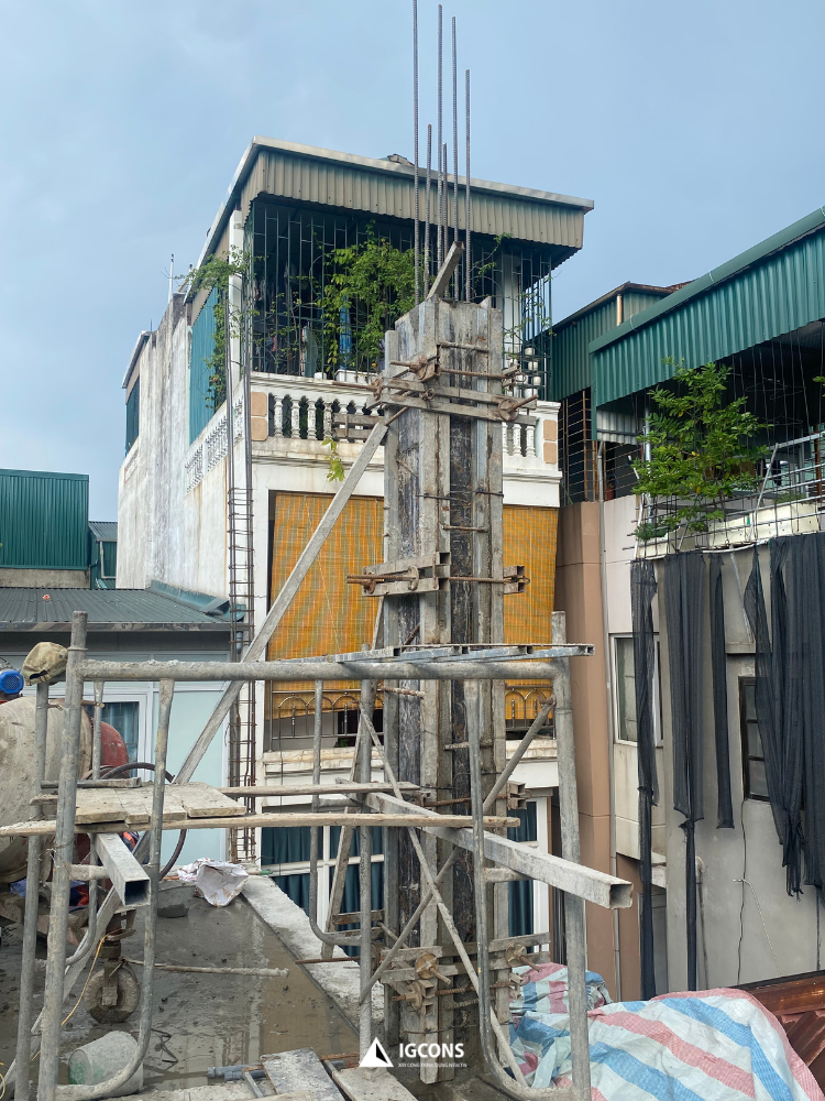 Tại công trình nhà anh Cường – Bùi Ngọc Dương, sau khi hoàn tất công tác đổ bê tông sàn tầng 3 và tháo dỡ cốp pha sàn an toàn, đội thi công IGCONS đã nhanh chóng triển khai hạng mục lắp dựng cốp pha và cốt thép cột tầng 4 – một giai đoạn then chốt trong quá trình hoàn thiện phần kết cấu chịu lực của công trình.