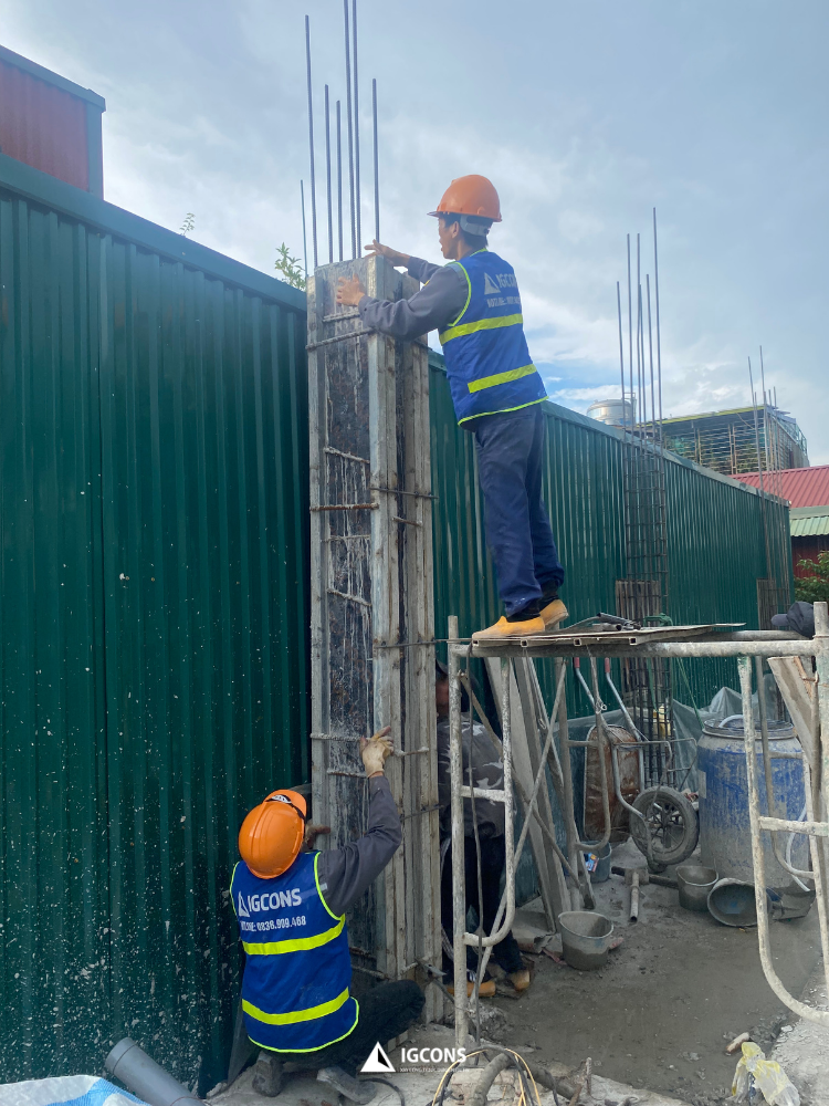 Đây là bước đòi hỏi độ chính xác kỹ thuật cao, bởi hệ thống cột đóng vai trò quan trọng trong việc chịu tải trọng và đảm bảo độ ổn định cho toàn bộ khối nhà. Chính vì vậy, các kỹ sư và giám sát của IGCONS luôn kiểm tra kỹ lưỡng từng chi tiết:
