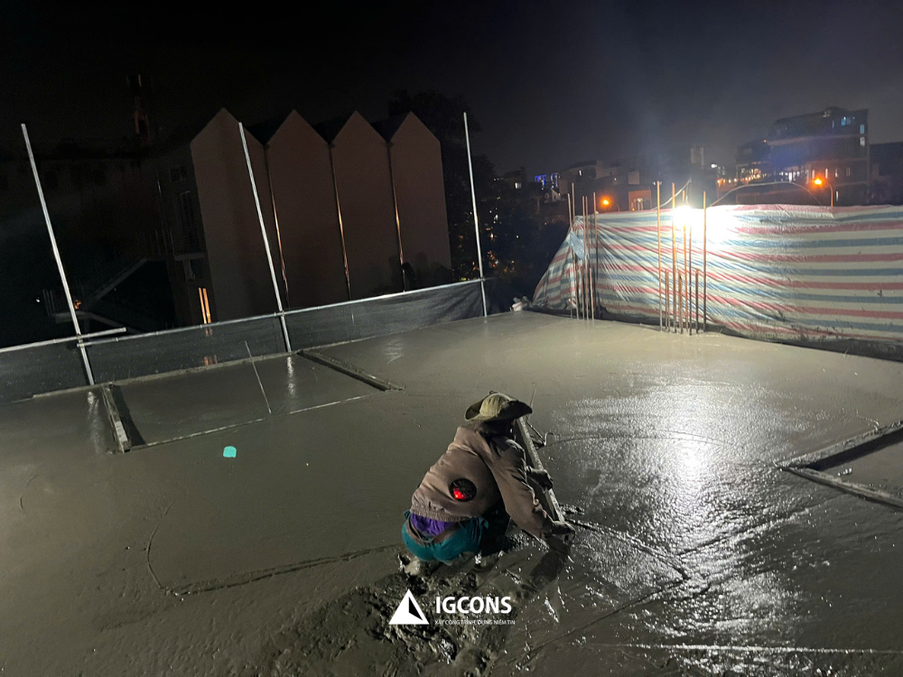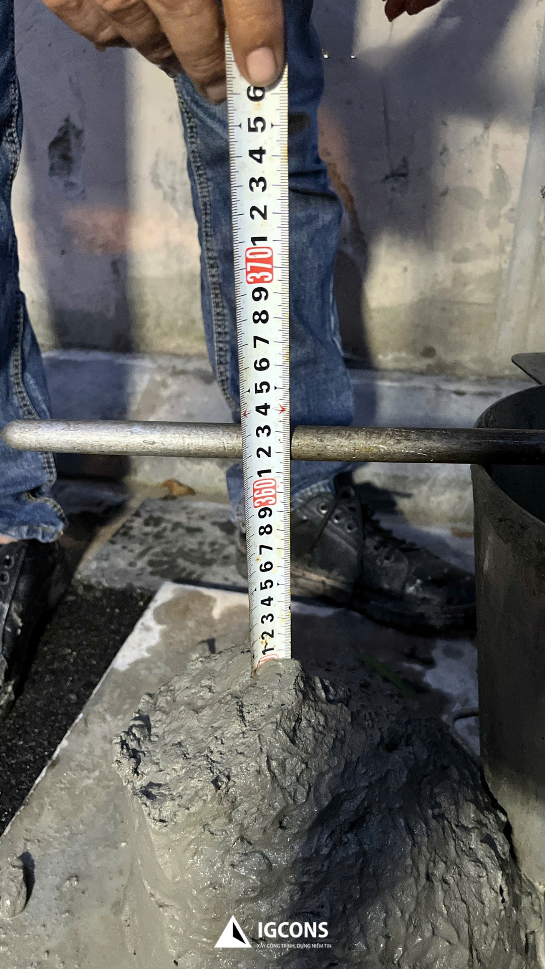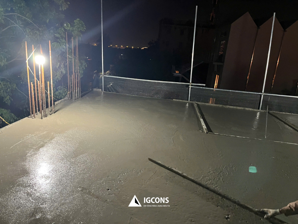 Trong quá trình thi công, bê tông được trộn theo đúng cấp phối, đạt mác thiết kế và được kiểm soát chặt chẽ từ khâu vận chuyển đến khi đổ. Việc thi công được tiến hành liên tục, kết hợp đầm dùi để loại bỏ bọt khí và đảm bảo bê tông đặc chắc, không bị rỗ. Đội ngũ kỹ sư giám sát IGCONS thường xuyên theo dõi trực tiếp, kiểm tra từng công đoạn nhằm đảm bảo đúng kỹ thuật, tiến độ và an toàn lao động.