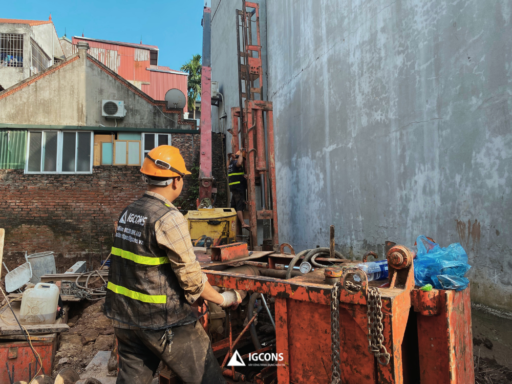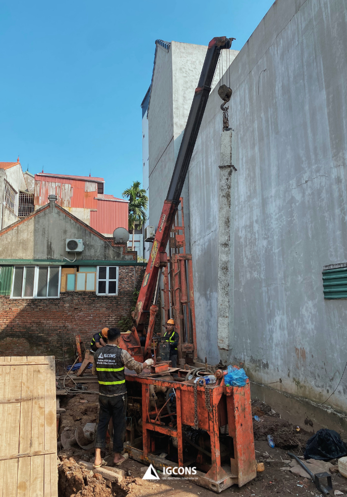 Công trình được xây dựng với quy mô 4 tầng 1 tum, do đó hệ móng được thiết kế phù hợp với điều kiện địa chất khu vực nhằm đảm bảo tải trọng công trình được truyền xuống nền đất một cách an toàn và hiệu quả. Trong quá trình thi công, đội ngũ kỹ sư và giám sát IGCONS đặc biệt chú trọng đến việc kiểm soát lực ép, độ sâu cọc và chất lượng cọc nhằm đảm bảo đúng yêu cầu kỹ thuật theo hồ sơ thiết kế.