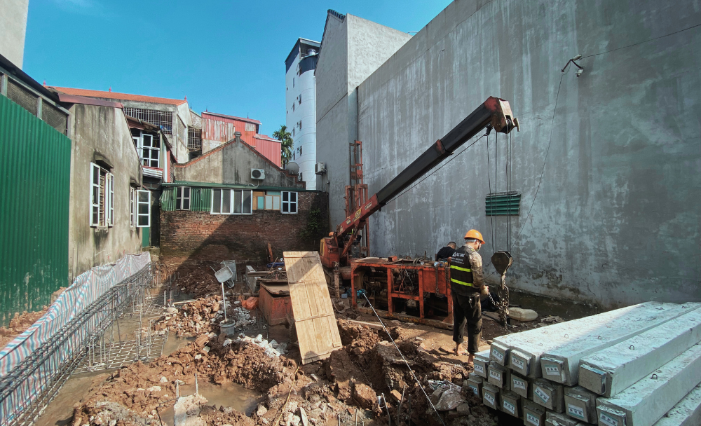 Tại dự án nhà chị Minh Anh tại khu vực Việt Hưng, sau khi hoàn tất công tác chuẩn bị mặt bằng và định vị tim mốc công trình, đội thi công IGCONS đã chính thức triển khai công tác ép cọc móng – hạng mục nền tảng quan trọng quyết định đến độ ổn định và khả năng chịu lực của toàn bộ công trình.