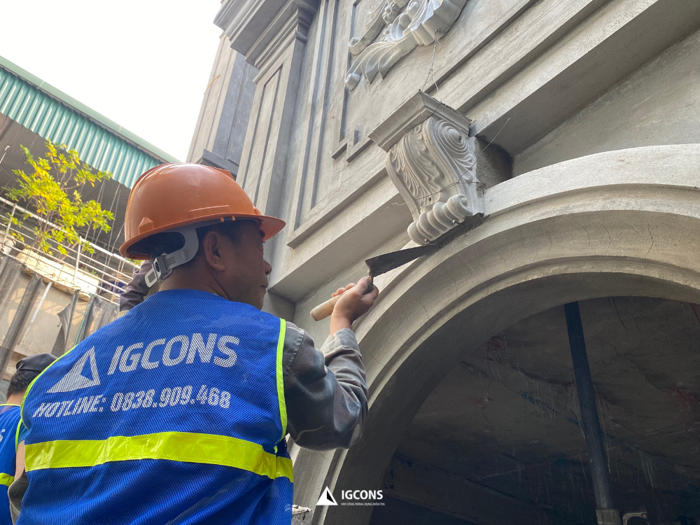 Công trình được thiết kế theo phong cách tân cổ điển, vì vậy đội ngũ kiến trúc sư và thợ thi công IGCONS đặc biệt chú trọng đến từng chi tiết phào chỉ, tỷ lệ hình khối và vật liệu hoàn thiện để đảm bảo yếu tố sang trọng, bền vững và chuẩn thẩm mỹ.