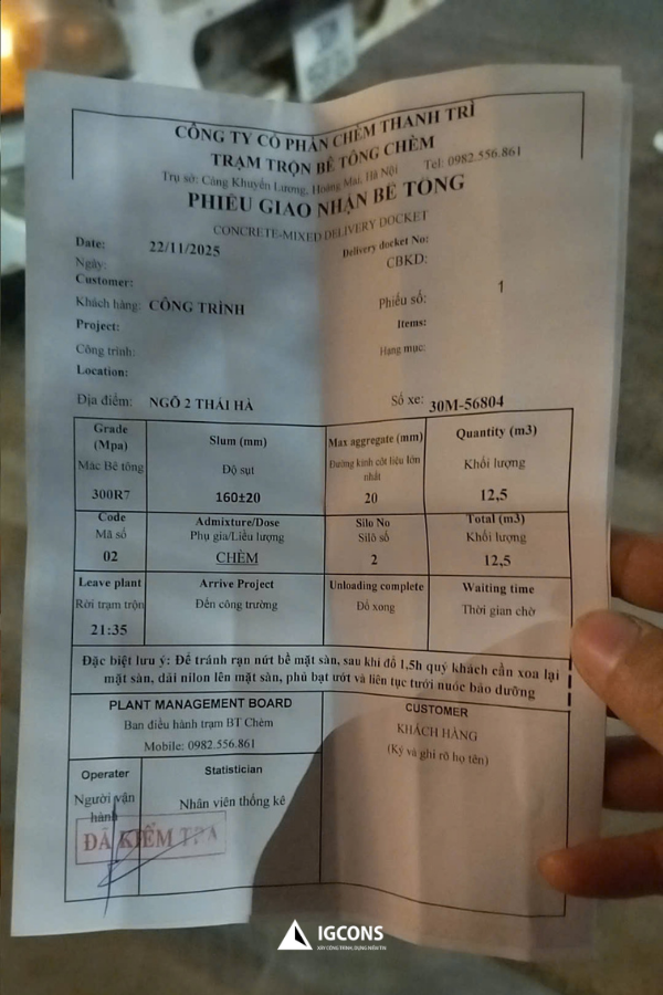 Tại dự án của anh Việt, Thái Hà, sau khi hoàn thiện các công đoạn cốp pha – cốt thép và kiểm định toàn bộ hệ thống kết cấu của tầng 5, đội thi công IGCONS đã chính thức bước vào hạng mục đổ bê tông sàn tầng 5 – một trong những giai đoạn quan trọng nhất để đảm bảo độ vững chắc và an toàn cho toàn bộ công trình.