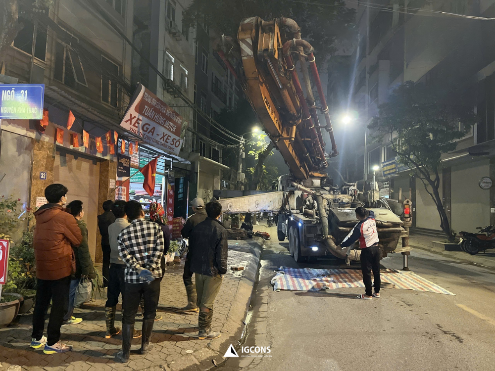 Tại công trình Nguyễn Khả Trạc của chú Dụng, sau khi hoàn tất công tác chuẩn bị mặt bằng, đào móng và kiểm tra toàn bộ hệ thống cốt thép, cốp pha theo đúng hồ sơ thiết kế, đội thi công IGCONS đã chính thức triển khai hạng mục đổ bê tông móng – bước khởi đầu quan trọng, quyết định trực tiếp đến khả năng chịu lực và độ bền vững lâu dài của toàn bộ công trình.