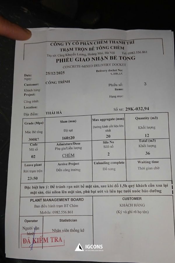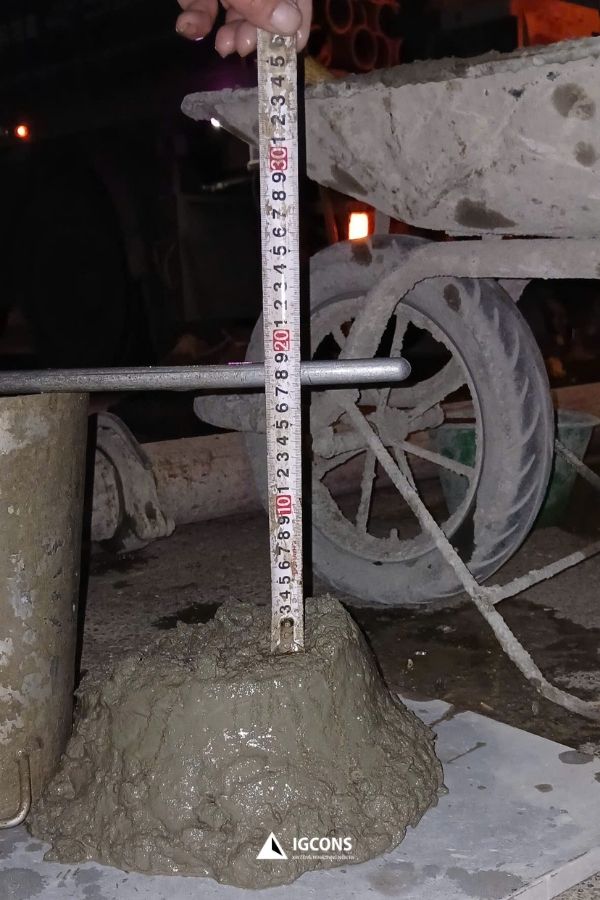 Trong quá trình thi công, bê tông được cấp phối đúng tiêu chuẩn, đổ liên tục theo quy trình kỹ thuật, kết hợp đầm rung đảm bảo độ đặc chắc, hạn chế tối đa rỗ tổ ong và sai lệch kết cấu. Đội ngũ kỹ sư và giám sát IGCONS thường xuyên theo dõi từng khâu, từ cao độ sàn, liên kết dầm – sàn đến chất lượng bề mặt sau khi hoàn thiện.