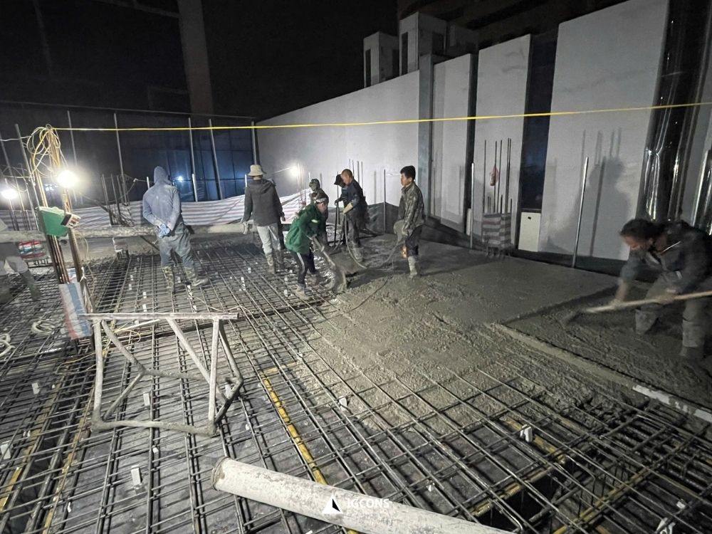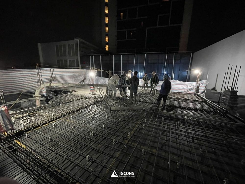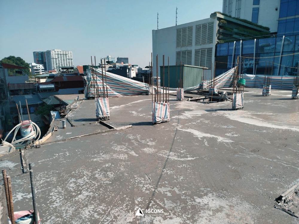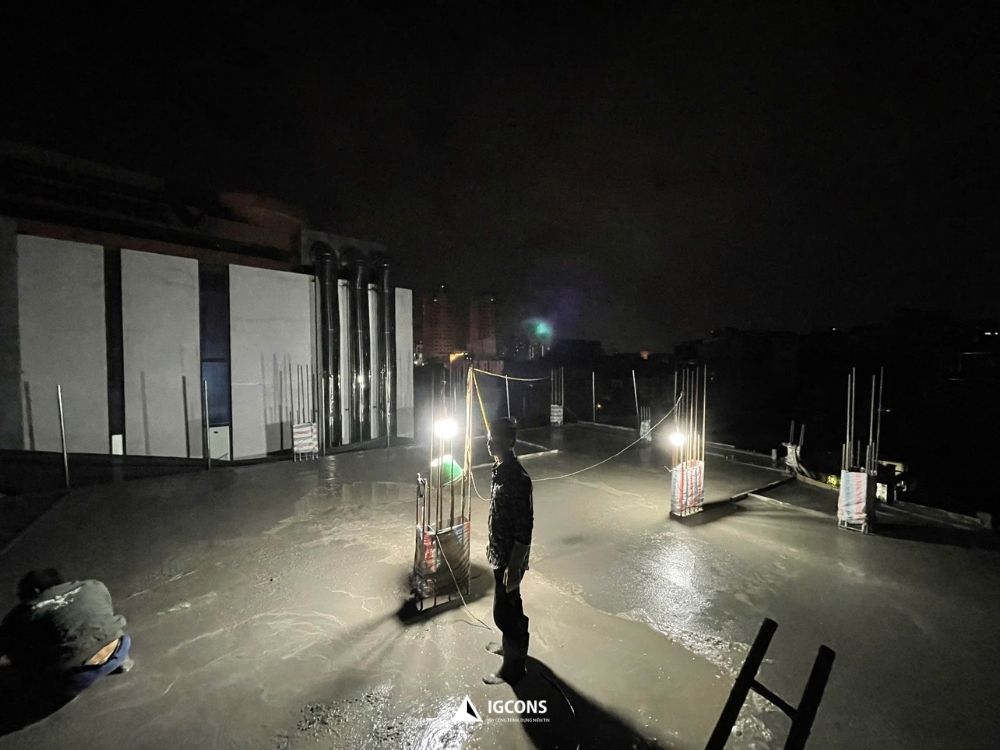 Trong quá trình thi công, bê tông được cấp phối đúng tiêu chuẩn, đổ liên tục theo quy trình kỹ thuật, kết hợp đầm rung đảm bảo độ đặc chắc, hạn chế tối đa rỗ tổ ong và sai lệch kết cấu. Đội ngũ kỹ sư và giám sát IGCONS thường xuyên theo dõi từng khâu, từ cao độ sàn, liên kết dầm – sàn đến chất lượng bề mặt sau khi hoàn thiện.