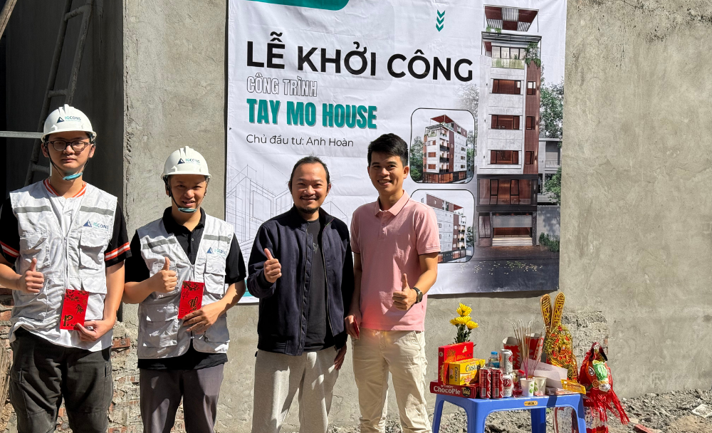 Tại dự án nhà anh Hoàn, 72 Tây Mỗ, sau khi hoàn tất hồ sơ thiết kế, biện pháp thi công và kiểm tra toàn bộ hiện trạng mặt bằng, đội thi công IGCONS đã chính thức tiến hành khởi công công trình 6 tầng 1 tum với diện tích sàn lên tới 150m². Đây là công trình có mục đích sử dụng đa năng: vừa để ở, vừa kinh doanh và kết hợp cho thuê, nên đội ngũ kiến trúc sư – kỹ sư IGCONS đặc biệt chú trọng tới sự bền vững, tối ưu công năng và khả năng khai thác hiệu quả trong tương lai.