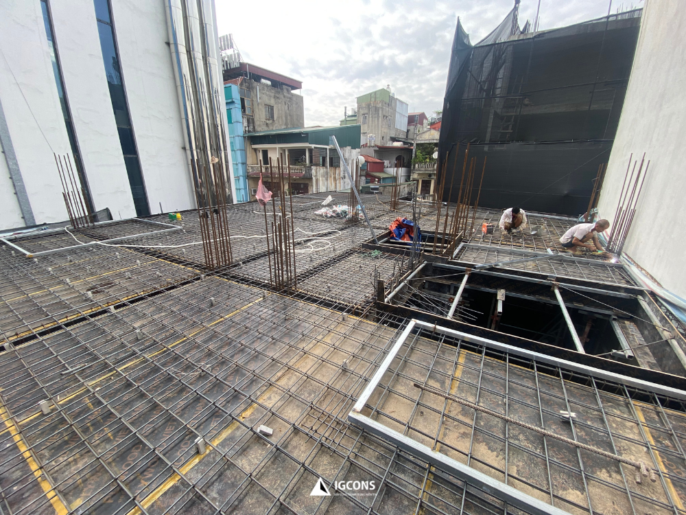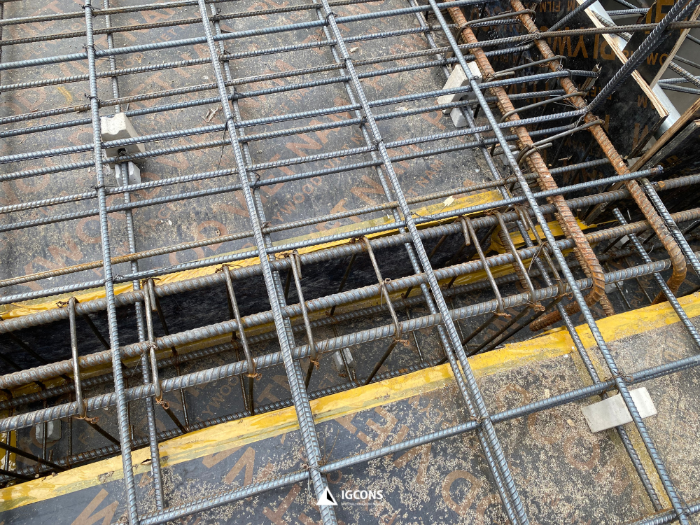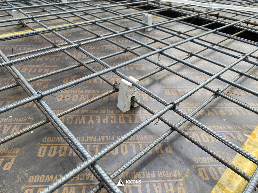 Sau khi hoàn tất việc lắp dựng cốp pha, bố trí cốt thép, đội ngũ kỹ sư IGCONS đã tiến hành kiểm tra chi tiết từng hạng mục, bao gồm độ phẳng, cao độ, và vị trí thép chủ – thép đai, nhằm đảm bảo mọi thông số đạt tiêu chuẩn kỹ thuật trước khi tiến hành đổ bê tông.