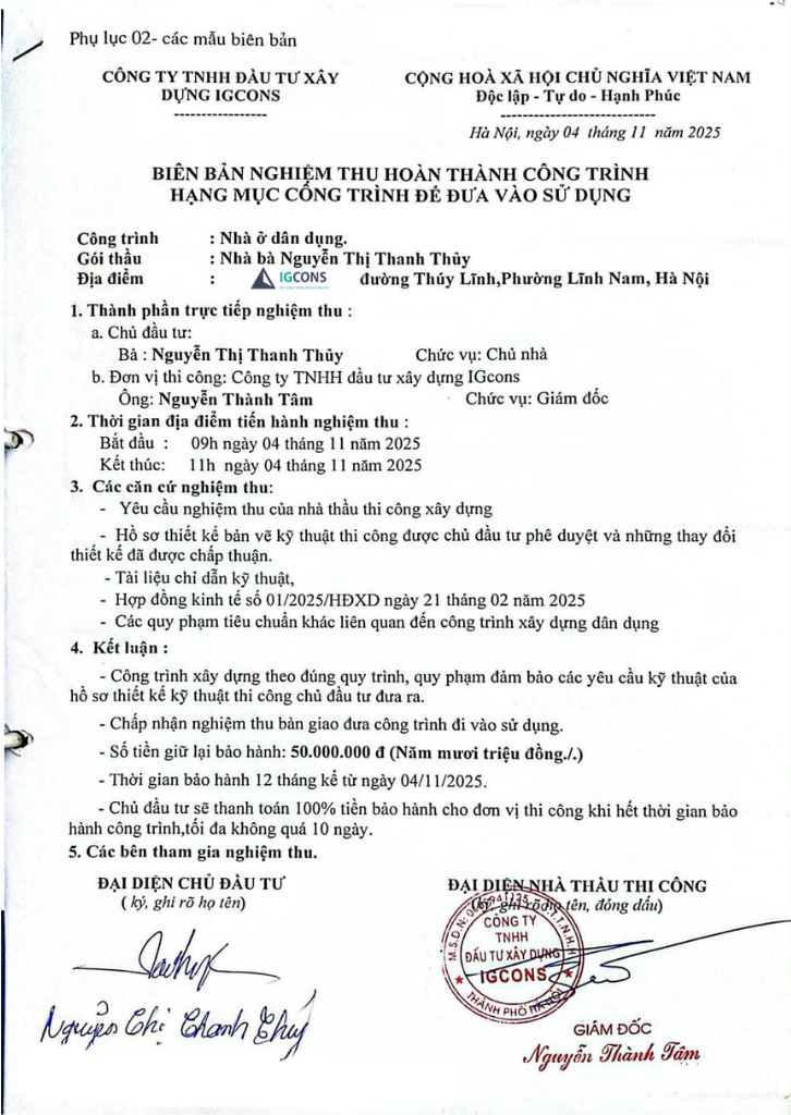 Sau khi hoàn thiện công trình, IGcons lập biên bản nghiệm thu và bàn giao chi tiết cho từng hạng mục. Tài liệu này ghi rõ phạm vi bảo hành của từng phần như kết cấu, chống thấm, hoàn thiện… kèm theo thời hạn cụ thể và điều kiện áp dụng.