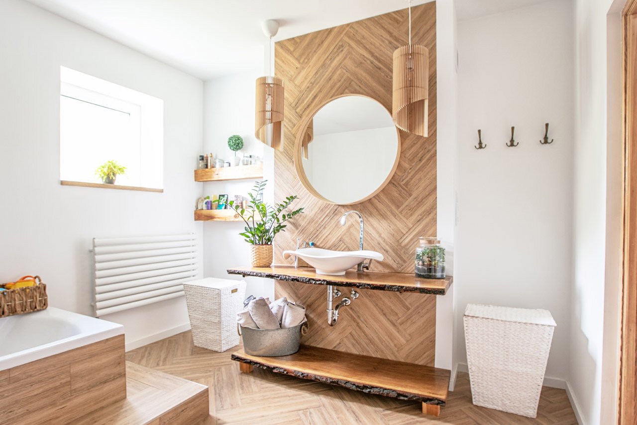 Phòng tắm Bắc Âu mang đến không gian thư giãn như spa tại nhà. Gạch ốp tường màu trắng hoặc xám nhạt, sàn gạch giả gỗ hoặc gạch xi măng tạo cảm giác ấm áp. Bồn tắm đứng kính trong suốt hoặc bồn tắm nằm màu trắng là điểm nhấn chính. Lavabo thiết kế đơn giản với chậu sứ trắng đặt trên tủ gỗ tự nhiên hoặc giá treo tối giản. Gương tròn hoặc vuông không khung hoặc khung gỗ mỏng treo tường.