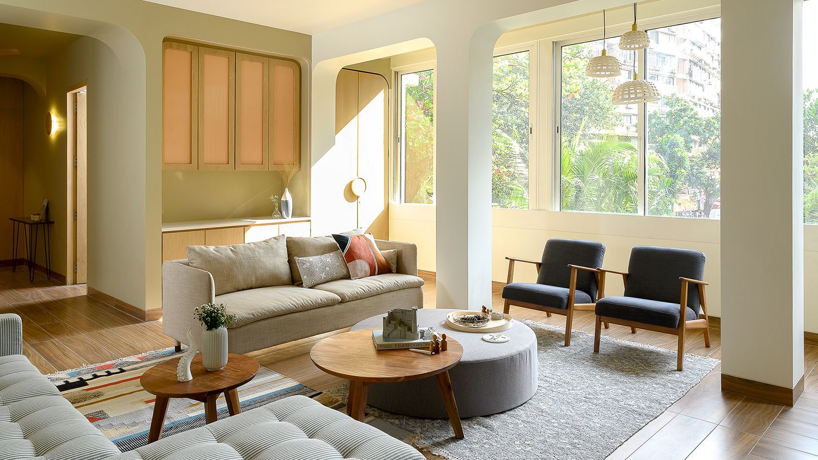 Phòng khách được thiết kế mở, thoáng đãng và tràn ngập ánh sáng. Bộ sofa thanh mảnh với chân cao, bọc vải lanh hoặc da màu xám, be. Bàn trà gỗ tròn hoặc oval đặt chính giữa không chiếm nhiều diện tích. Tường sơn trắng hoặc pastel nhẹ, sàn gỗ tự nhiên màu sáng như sồi tạo cảm giác ấm áp. Cửa sổ lớn với rèm mỏng tối đa hóa ánh sáng, cây xanh góc phòng tăng sự sống động.