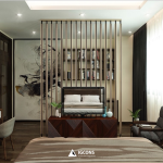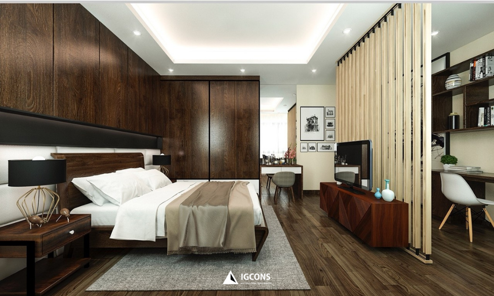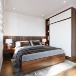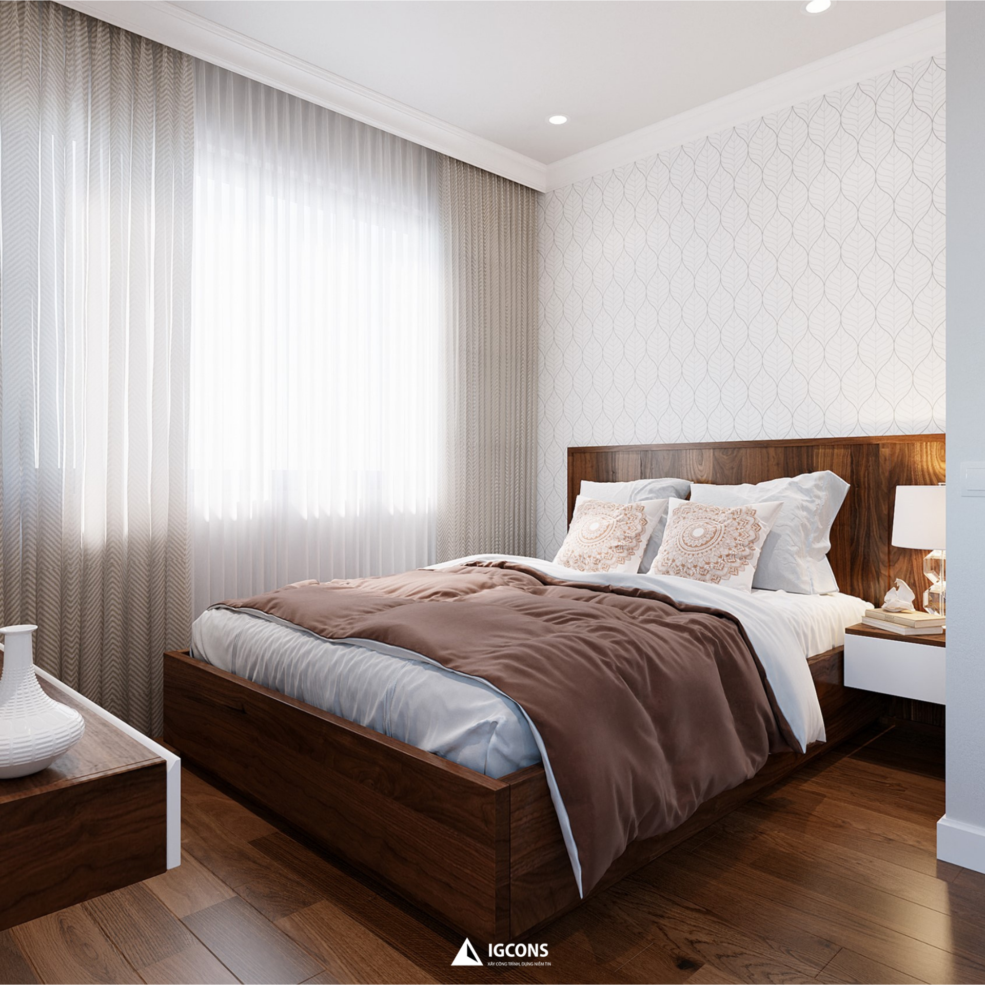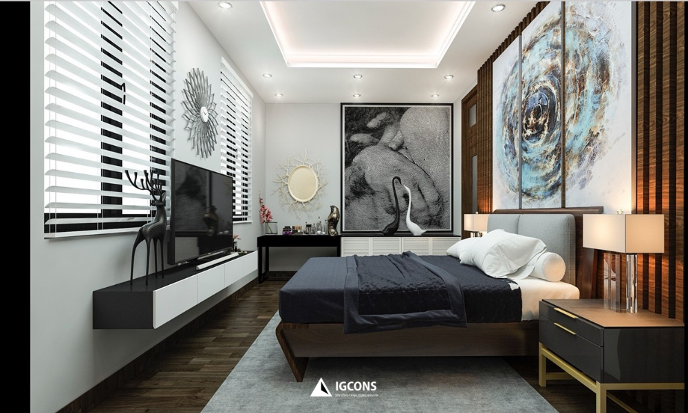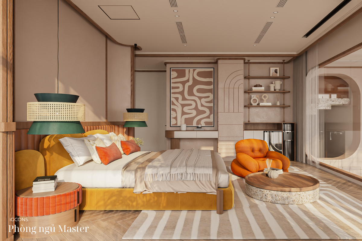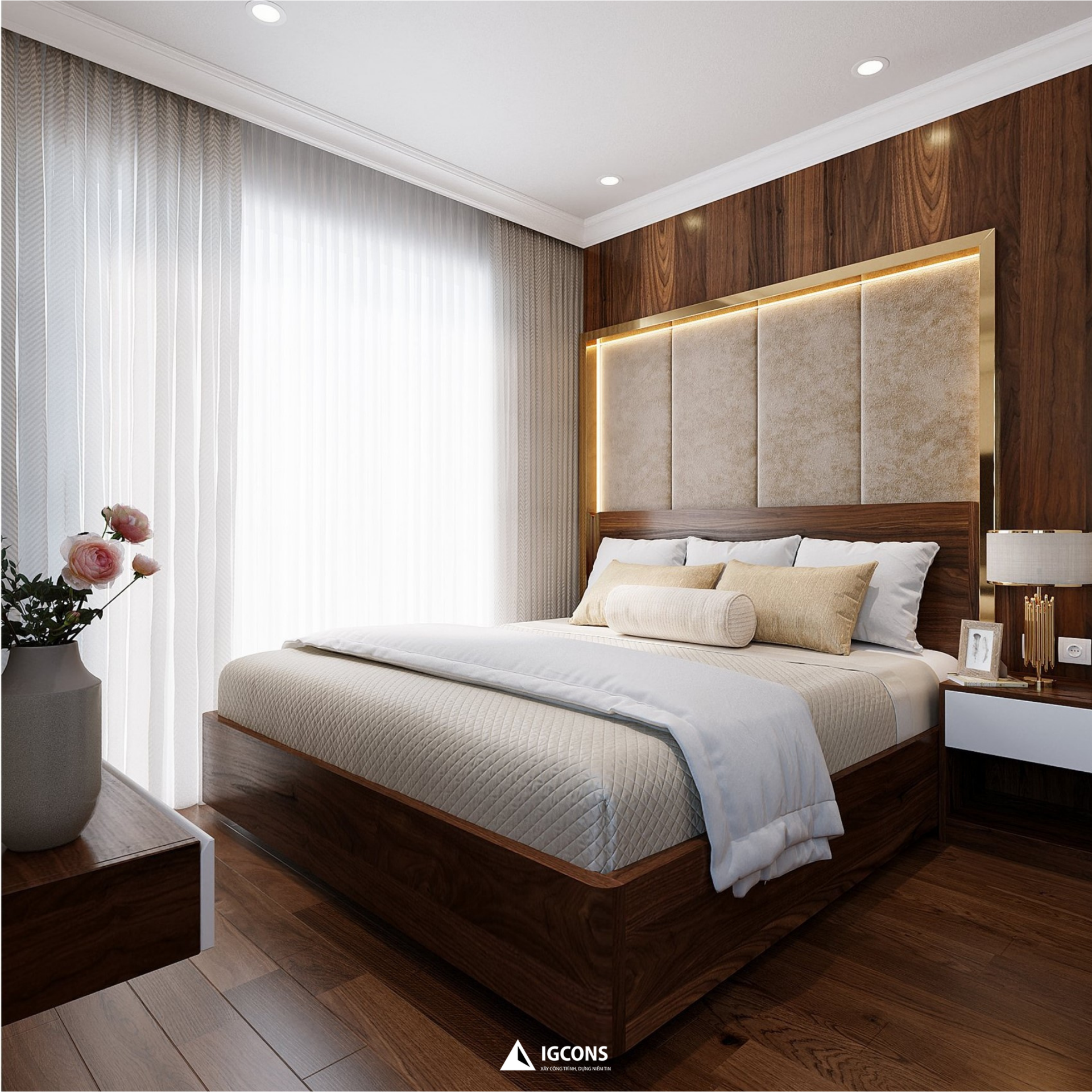 Phòng ngủ master được thiết kế theo phong cách hiện đại sang trọng, chú trọng sự cân bằng giữa thẩm mỹ và cảm giác thư giãn. Gam màu trung tính ấm kết hợp ánh sáng gián tiếp, chất liệu mềm mại và điểm nhấn tranh nghệ thuật tạo nên không gian nghỉ ngơi tinh tế, yên bình.