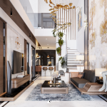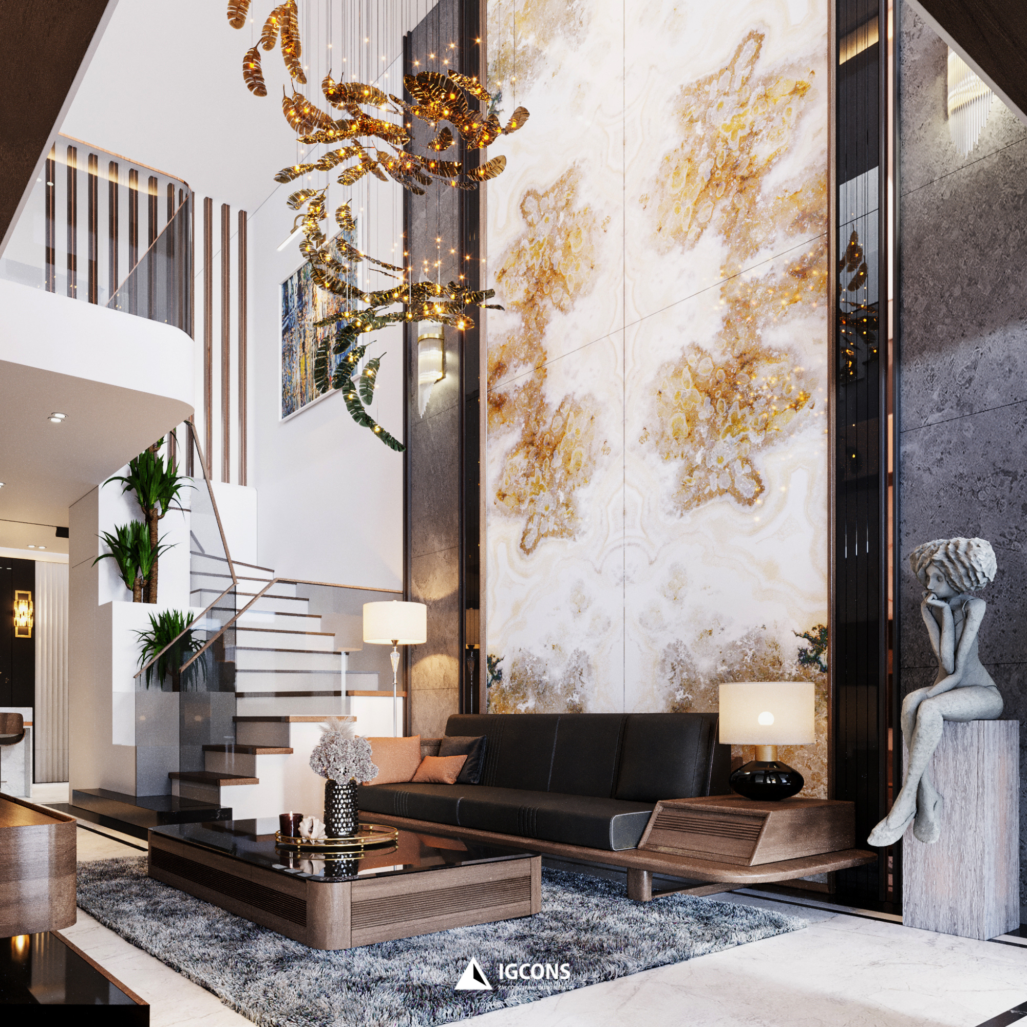 Thiết kế phòng khách hiện đại sang trọng với trần cao 2 tầng, đèn chùm vàng gold nghệ thuật, cầu thang xoắn trắng và tranh trừu tượng khổ lớn, tạo không gian sống đẳng cấp và ấn tượng.