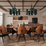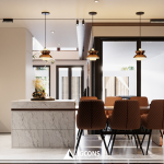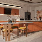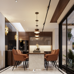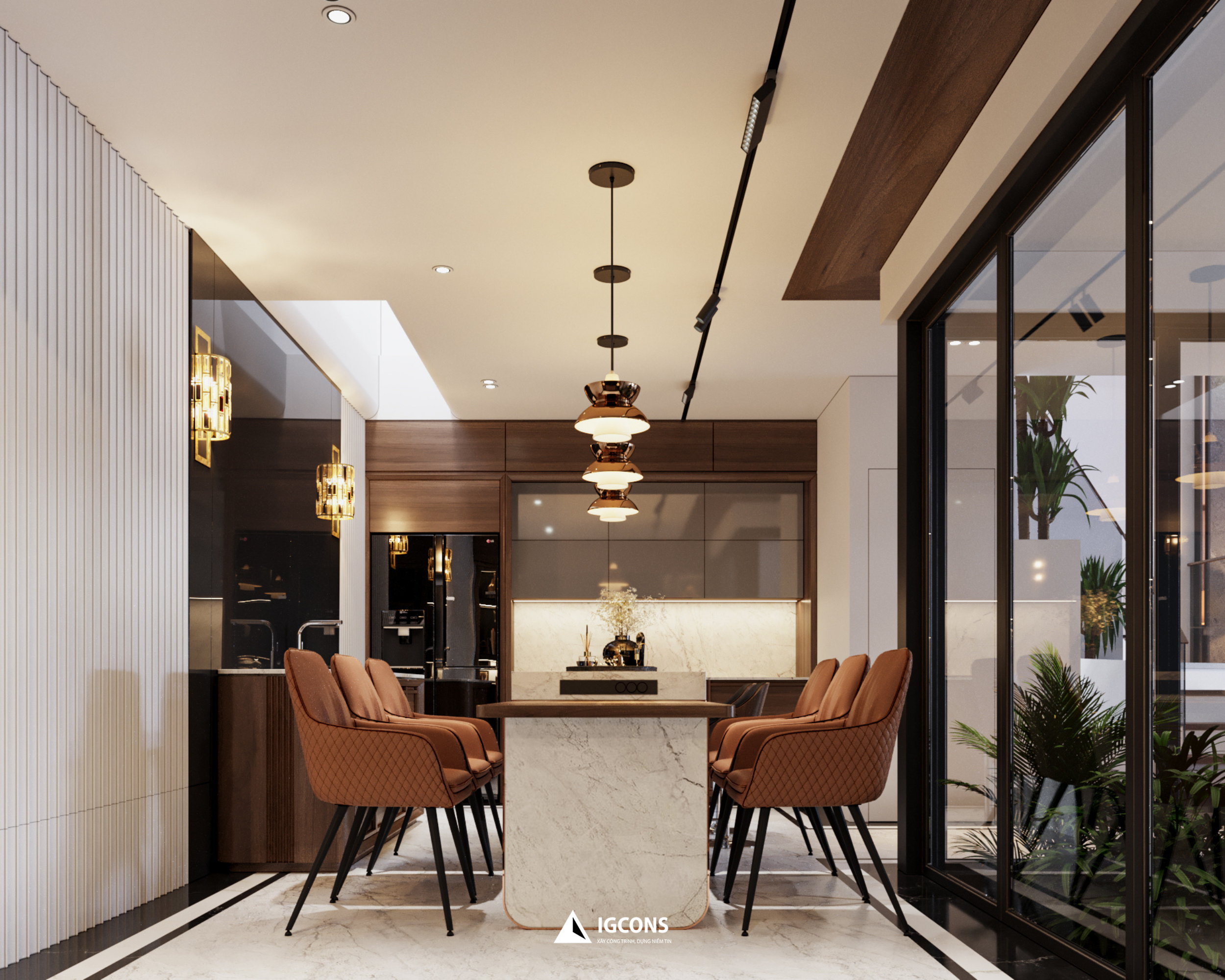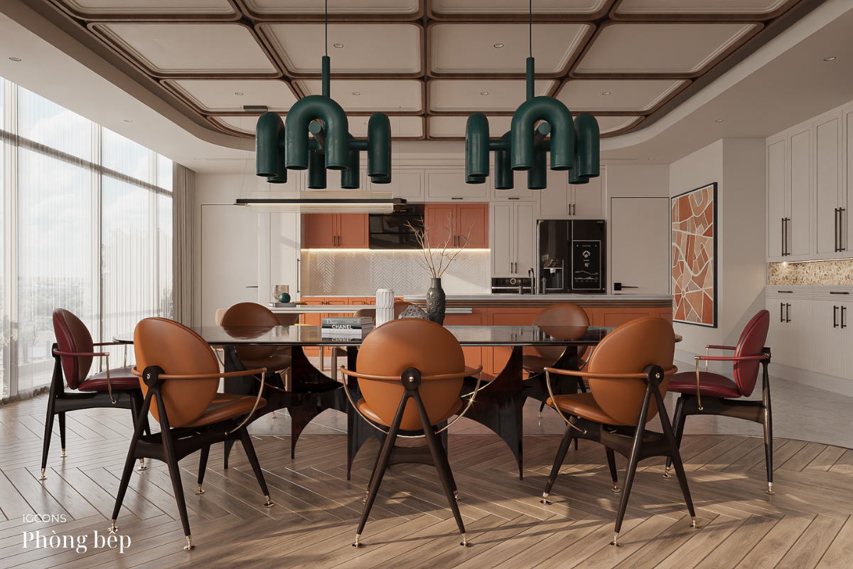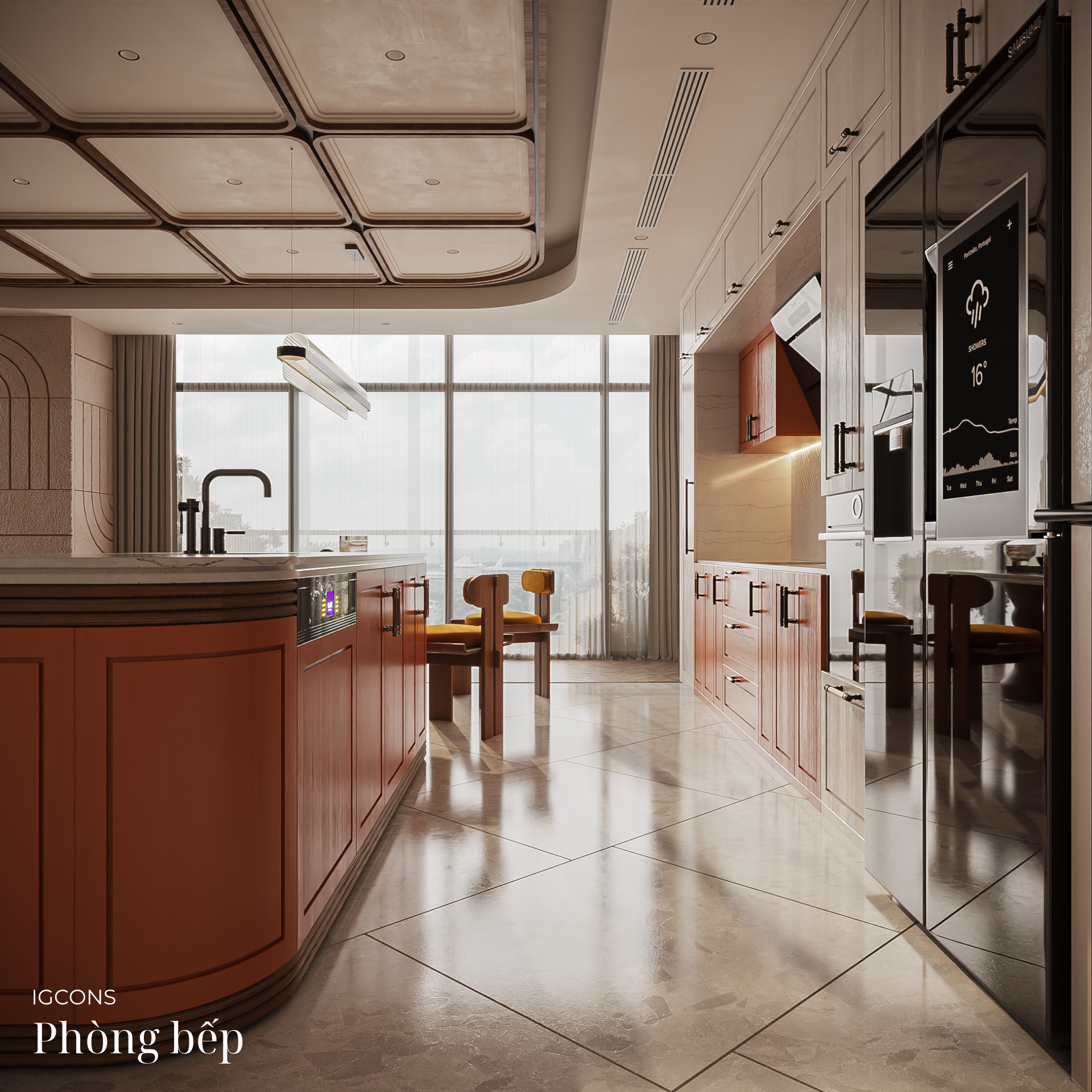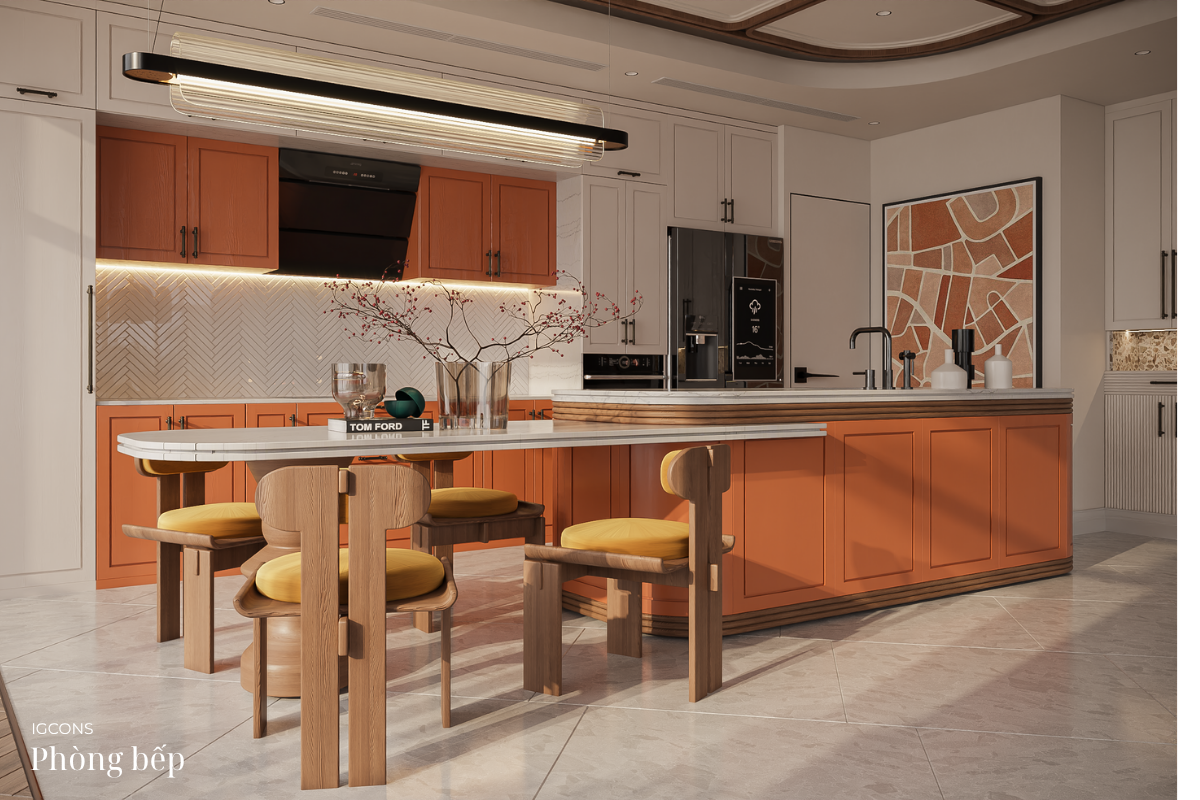 Phòng bếp được thiết kế theo phong cách hiện đại pha cổ điển (Modern Classic), nổi bật với hệ tủ cánh phẳng kết hợp phào chỉ tinh tế và gam màu cam đất ấm áp. Đảo bếp trung tâm cùng hệ đèn thả tạo điểm nhấn sang trọng, mang lại không gian nấu nướng vừa tiện nghi, vừa giàu tính thẩm mỹ.