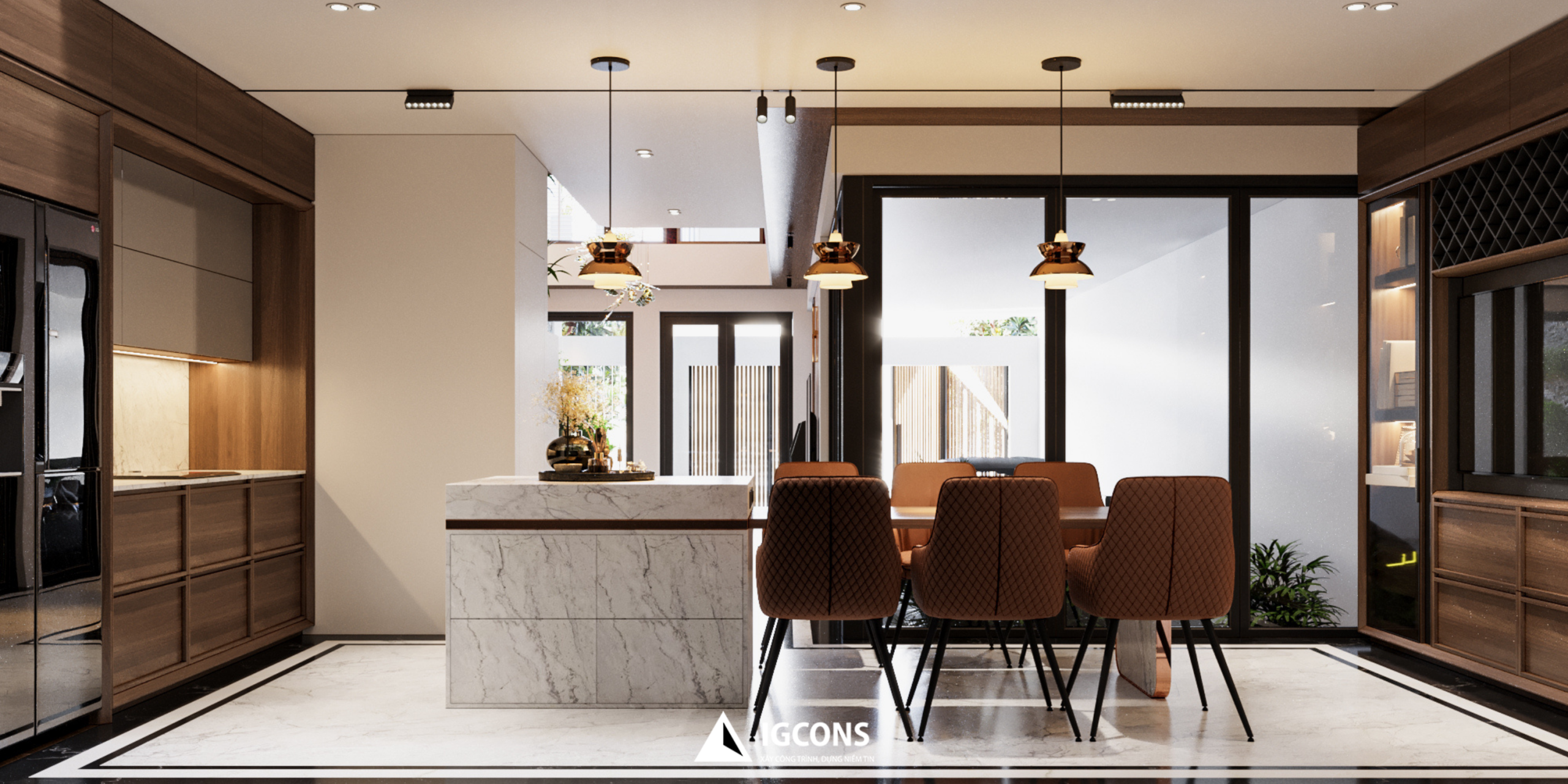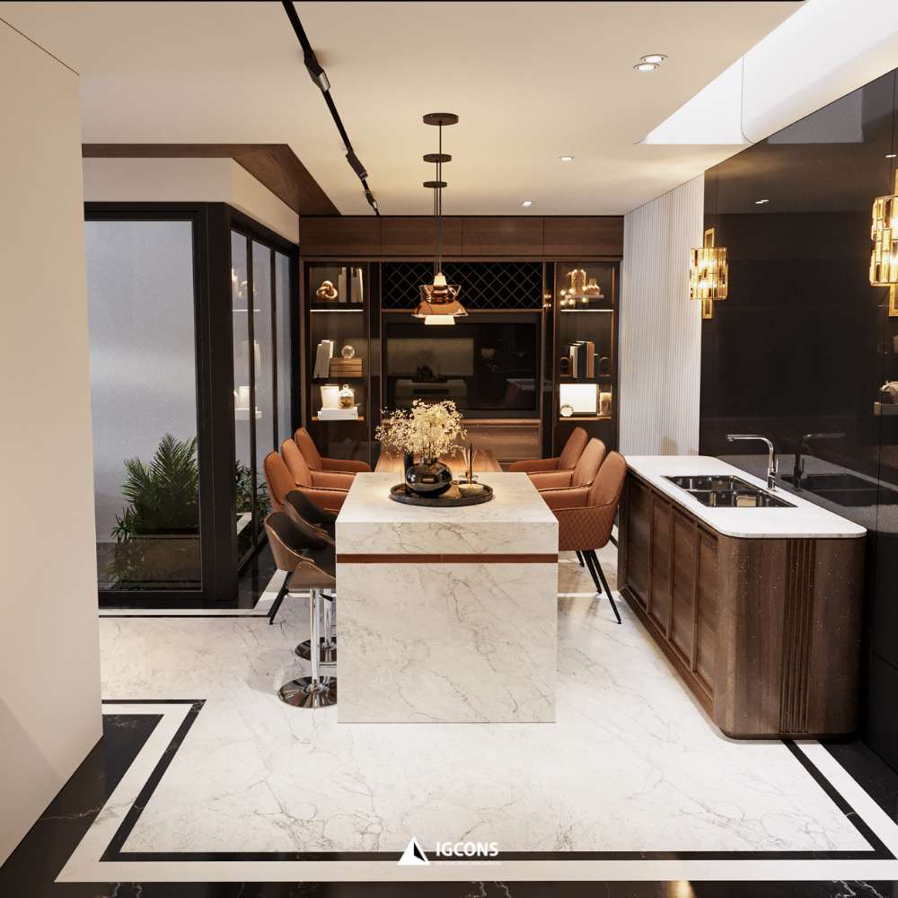 Thiết kế phòng bếp hiện đại có đảo bếp marble trắng, tủ bếp gỗ óc chó cao cấp kết hợp tủ rượu có đèn led và ghế bar da nâu sang trọng, tạo không gian bếp - ăn đa năng và đẳng cấp.