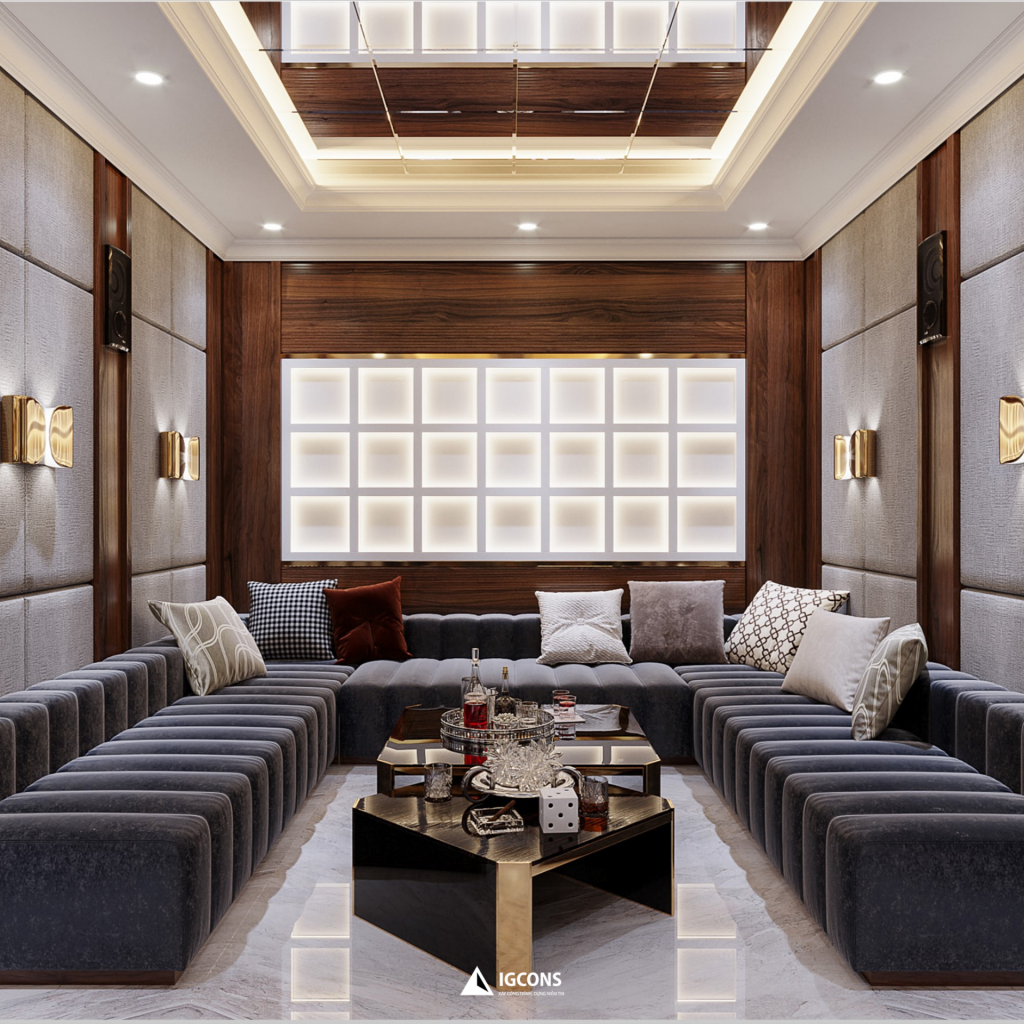 Thiết kế phòng khách tân cổ điển sang trọng với bộ sofa nhung xám khói đối xứng, trần thạch cao đèn led âm ẩn và tường ốp gỗ óc chó, tạo không gian tiếp khách đẳng cấp và ấm cúng