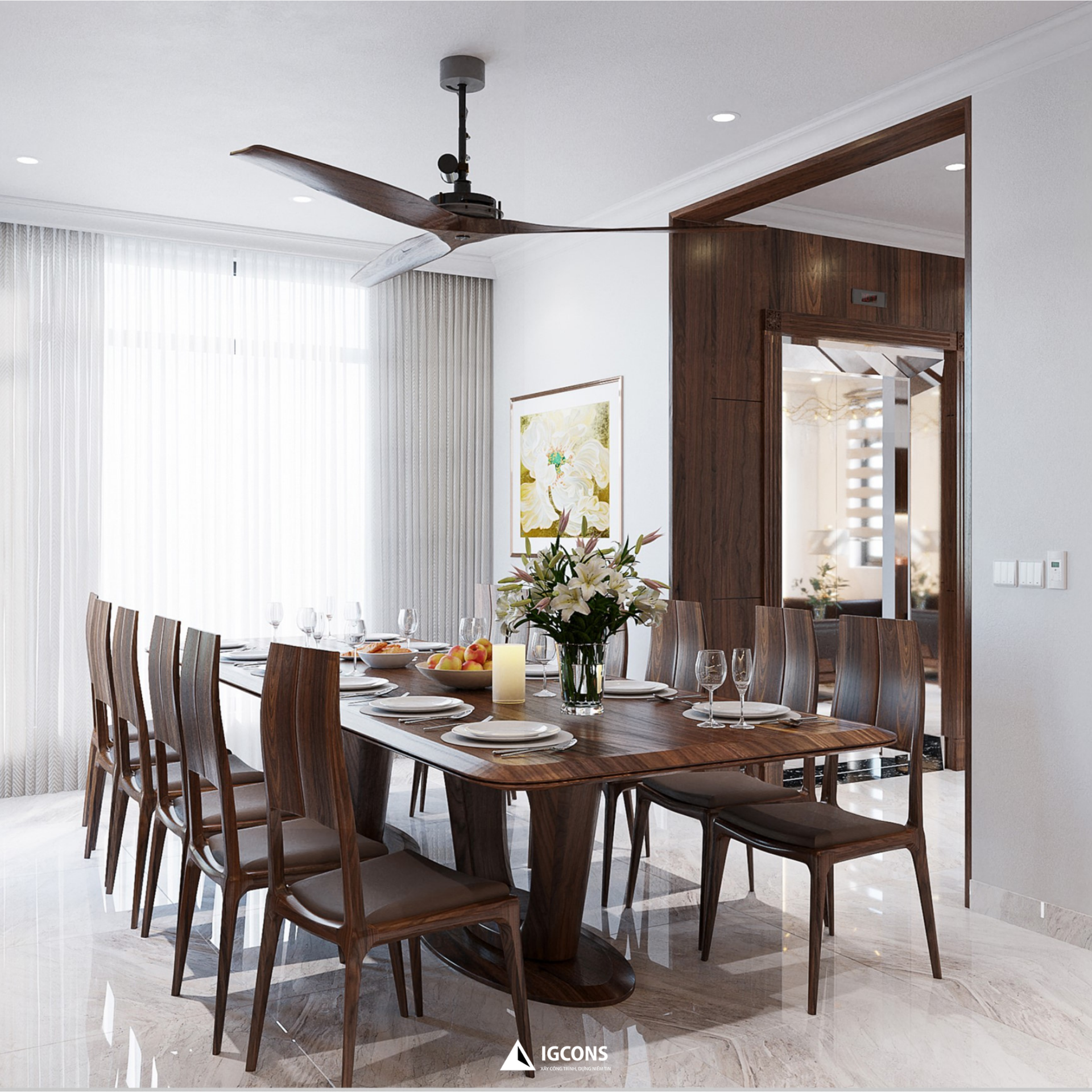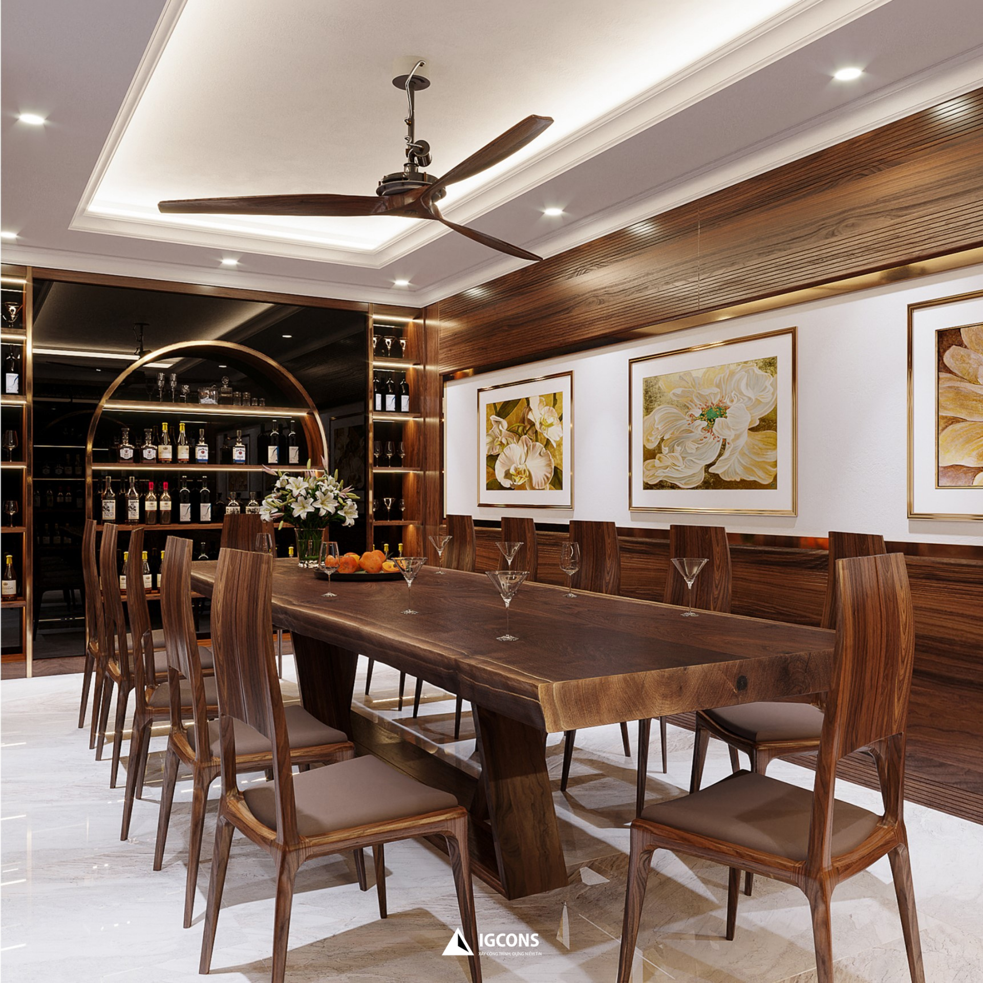 Thiết kế phòng ăn gỗ óc chó sang trọng với bàn ăn 10 người nguyên khối, tủ rượu kính đen cao cấp và tranh treo tường nghệ thuật, tạo không gian sum họp ấm cúng và đẳng cấp.