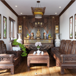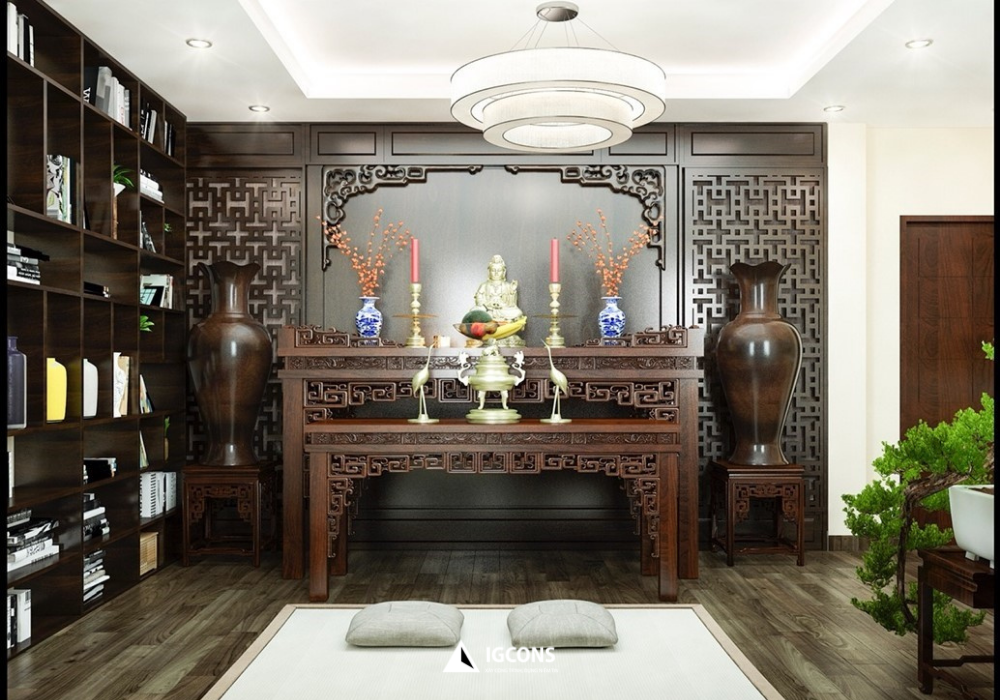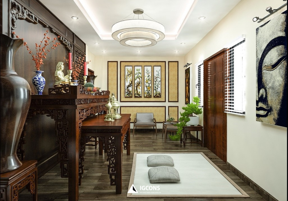 Thiết kế phòng khách phong cách Á Đông cổ điển với bàn ghế gỗ gụ chạm khắc tinh xảo, bàn thờ Phật truyền thống và đèn lồng cổ, tạo không gian trang nghiêm, phúc lộc cho gia đình đa thế hệ.