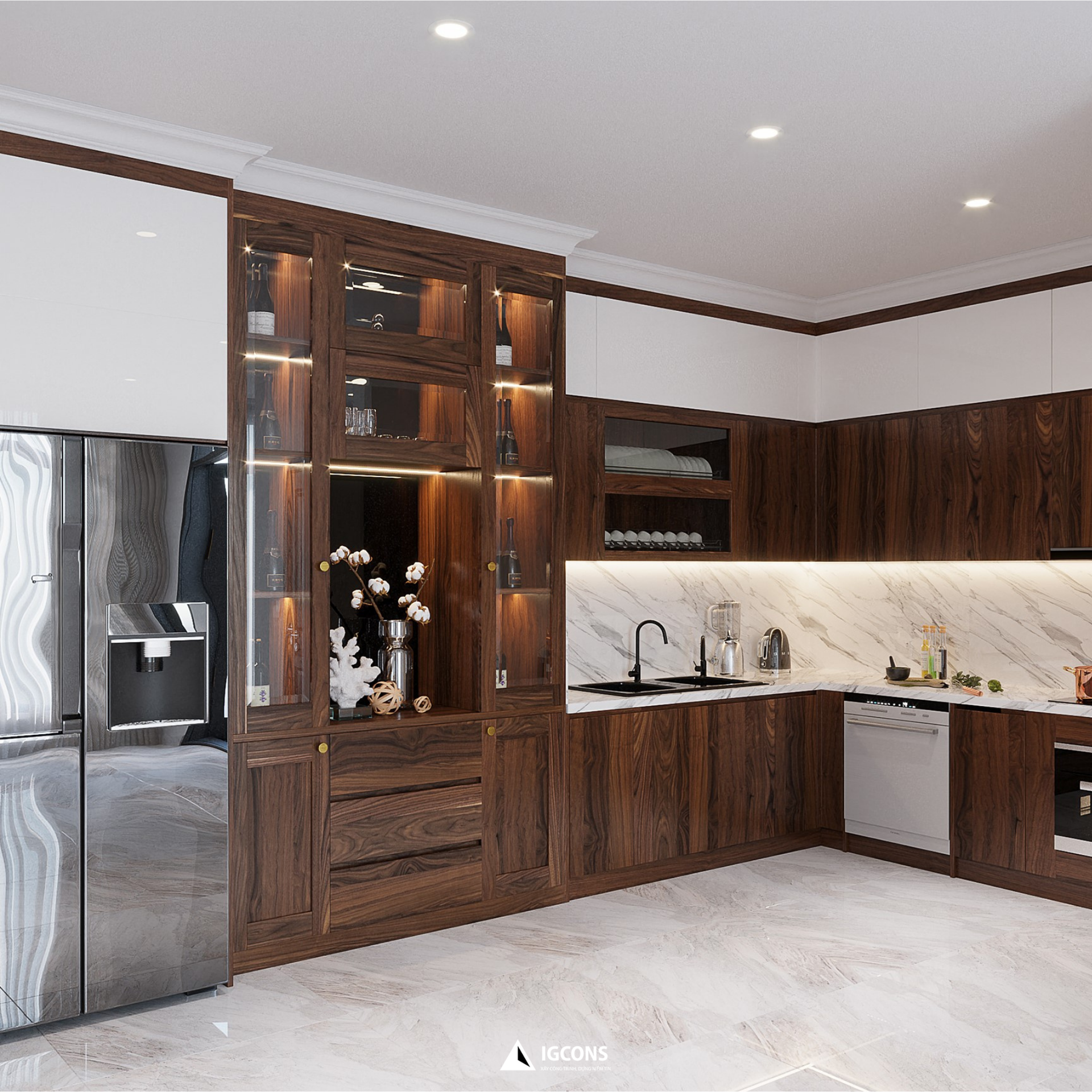 Thiết kế tủ bếp gỗ óc chó chữ L sang trọng với tủ rượu kính có đèn led, ốp tường đá marble trắng và thiết bị nhập khẩu cao cấp, tạo không gian bếp hiện đại và đẳng cấp