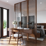 Thiết kế nội thất phòng ngủ master đa năng phong cách Japandi: giường ngủ gỗ óc chó tự nhiên có tab đầu giường tích hợp kệ để đồ và đèn ngủ, vách ngăn phòng ngủ nan gỗ óc chó ngang (horizontal slats) kết hợp bàn làm việc - bàn trang điểm gắn tường gỗ công nghiệp veneer, ghế làm việc gỗ tự nhiên kiểu Bắc Âu, tủ quần áo gỗ óc chó hiện đại, giấy dán tường 3D họa tiết moroccan màu trắng be tinh tế, rèm cửa 2 lớp voan trắng và rèm vải xám, tranh treo tường abstract gold, tạo không gian phòng ngủ chính đa chức năng vừa nghỉ ngơi vừa làm việc