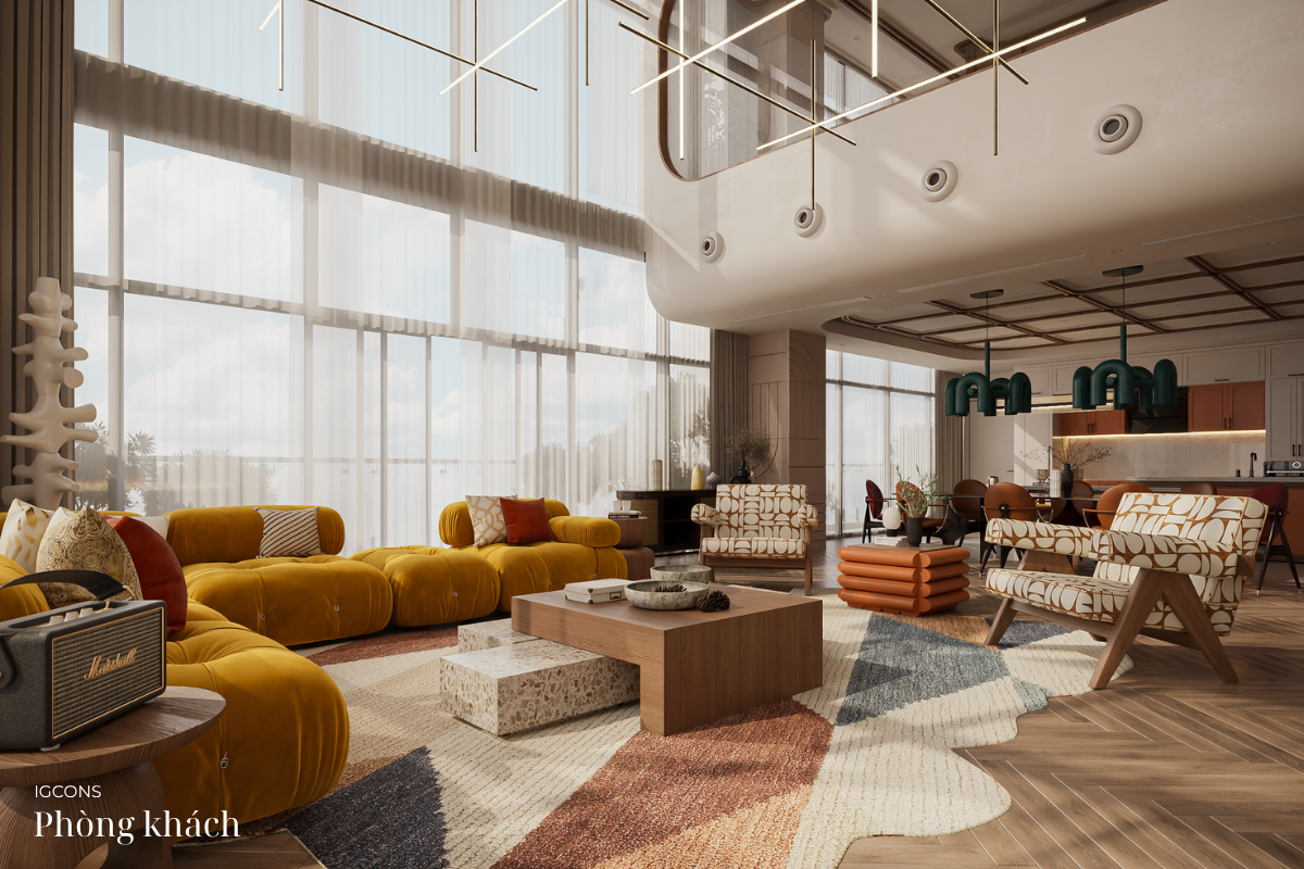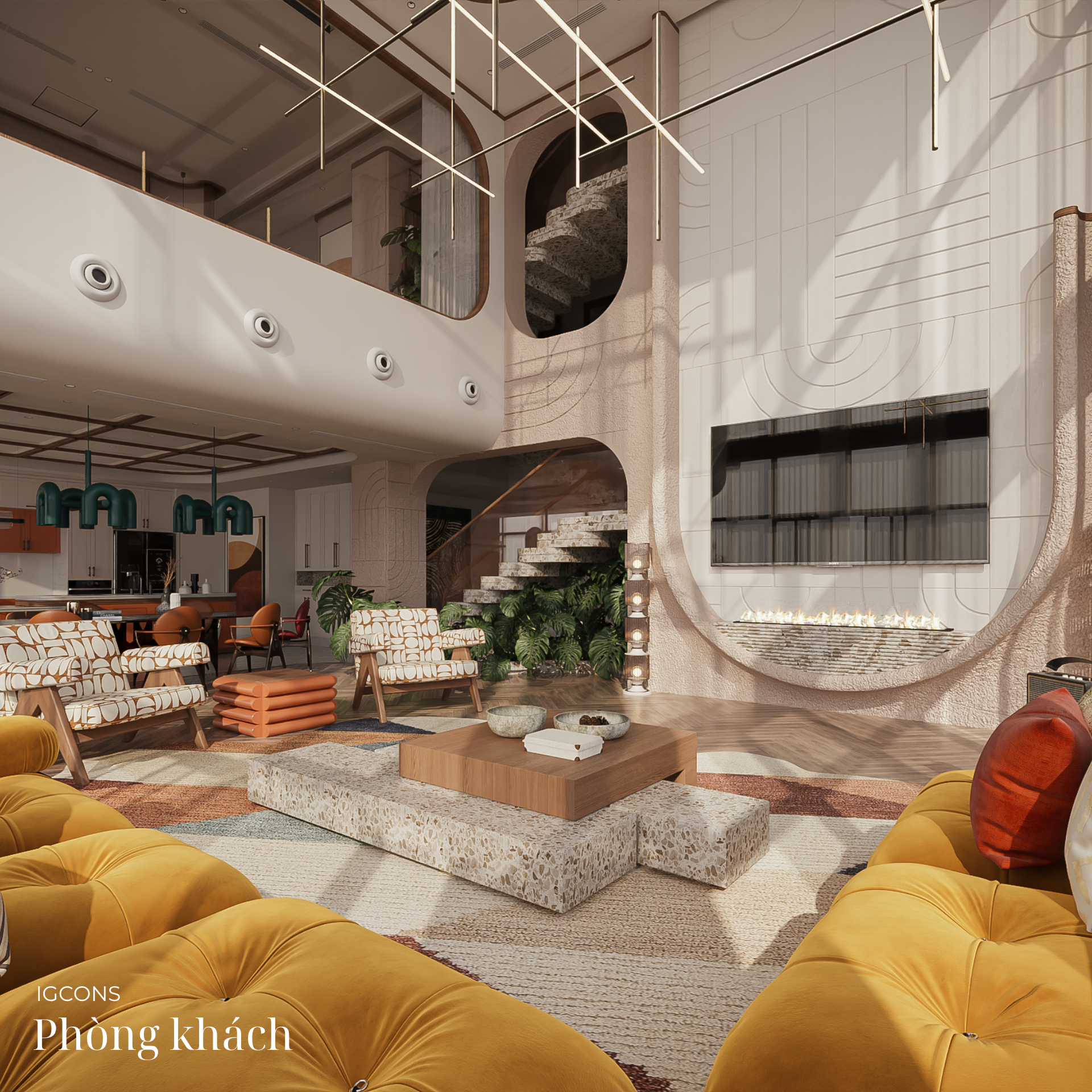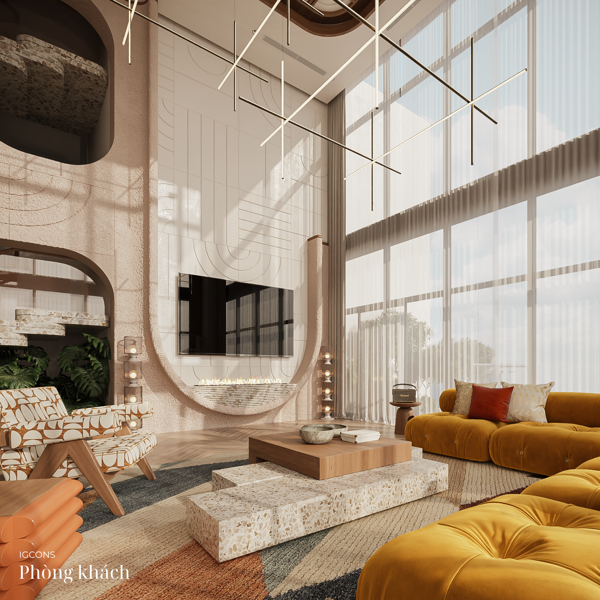 Phòng khách mang phong cách hiện đại cao cấp, nổi bật với không gian thông tầng thoáng rộng và hệ cửa kính lớn đón trọn ánh sáng tự nhiên. Nội thất phối màu táo bạo nhưng hài hòa, kết hợp hình khối mềm mại và đèn trang trí nghệ thuật, tạo nên tổng thể sang trọng, giàu cá tính và tính trải nghiệm.