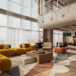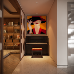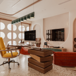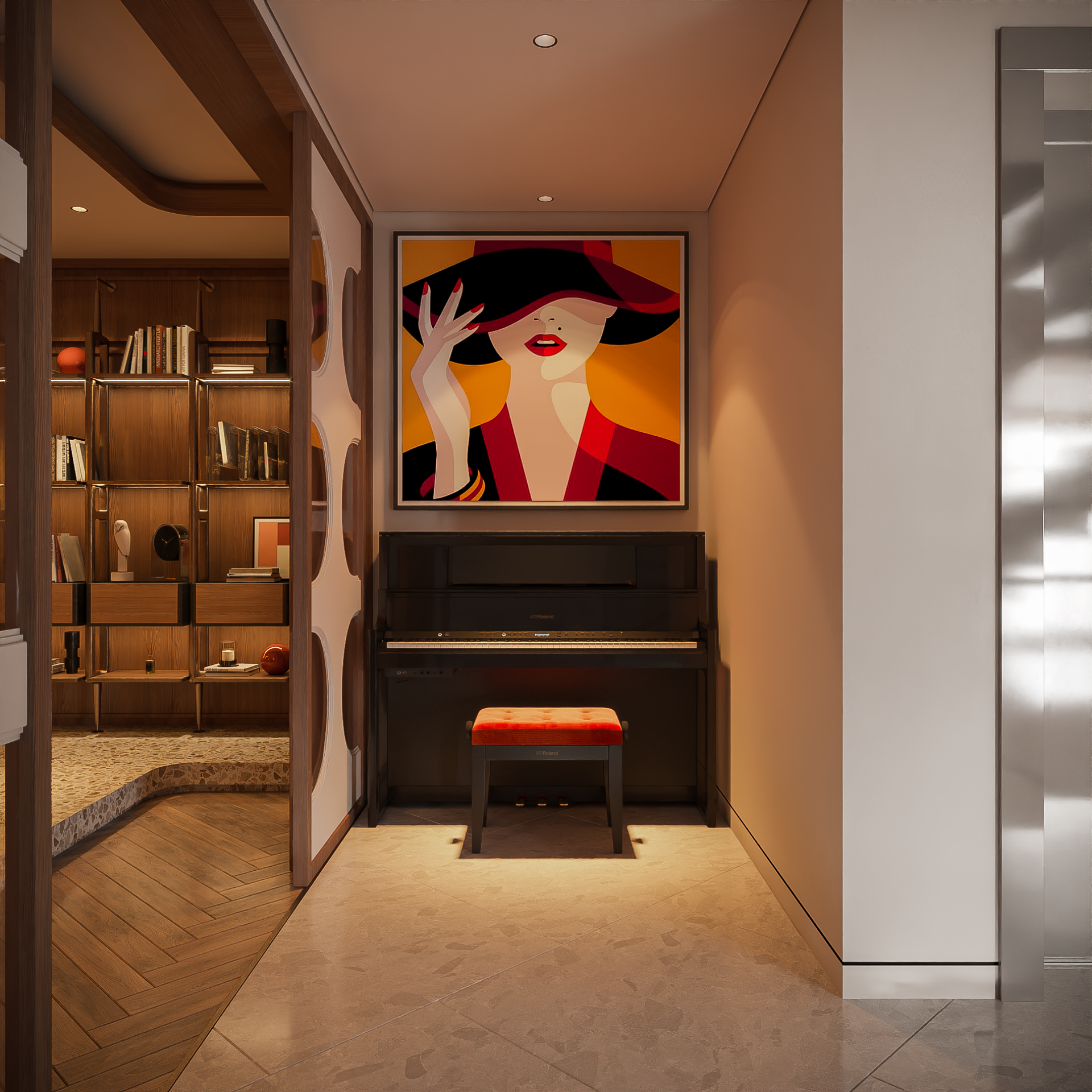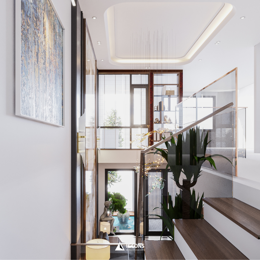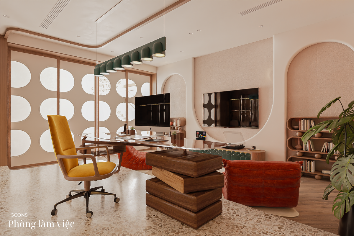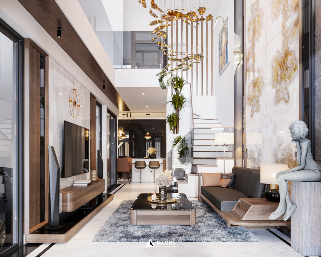 Phòng khách mang phong cách hiện đại cao cấp, nổi bật với không gian thông tầng thoáng rộng và hệ cửa kính lớn đón trọn ánh sáng tự nhiên. Nội thất phối màu táo bạo nhưng hài hòa, kết hợp hình khối mềm mại và đèn trang trí nghệ thuật, tạo nên tổng thể sang trọng, giàu cá tính và tính trải nghiệm.