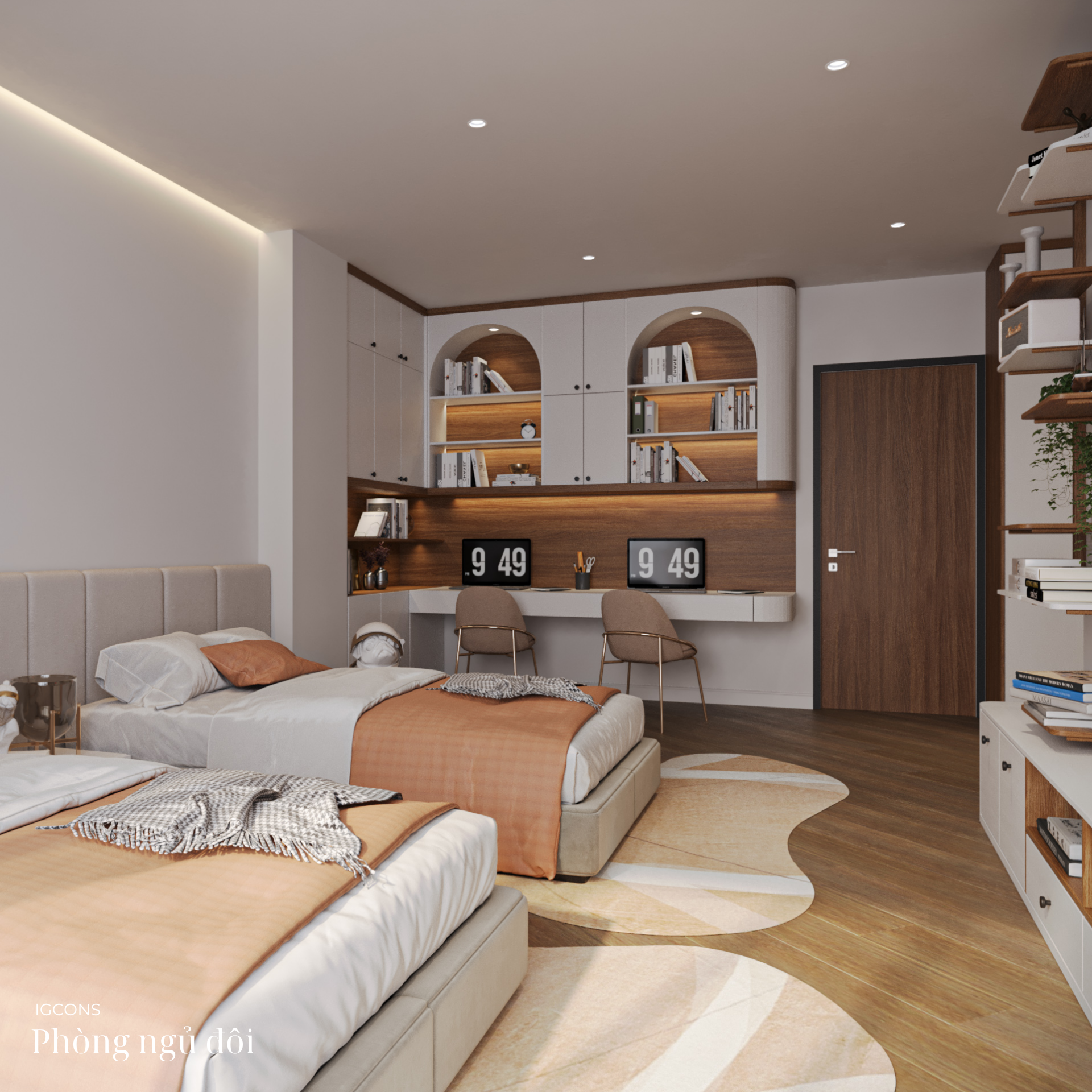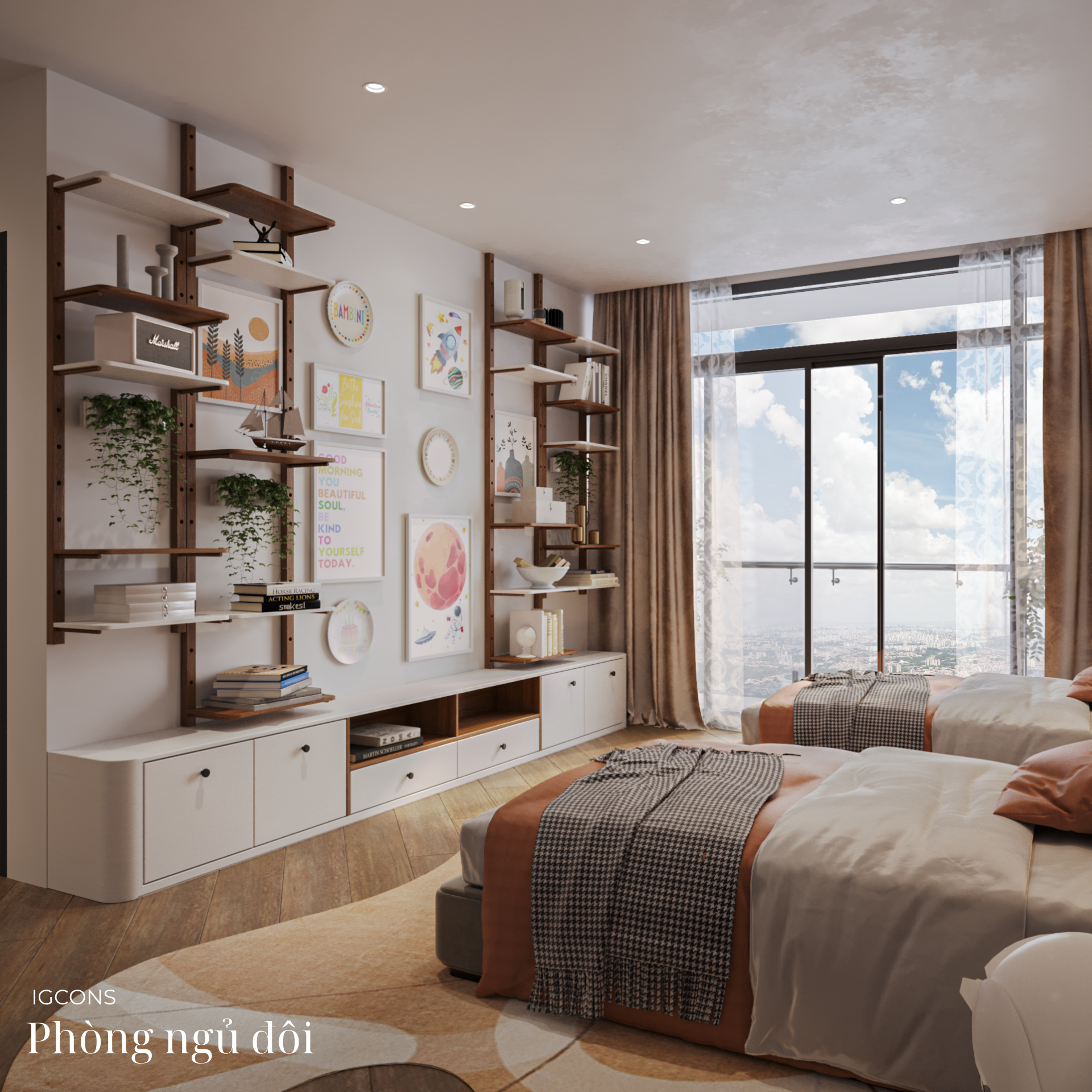 Thiết kế phòng ngủ đôi cho bé hiện đại với 2 giường đơn, kệ sách treo tường sáng tạo và cửa kính lớn view đẹp, tạo không gian riêng tư và thân thiện cho 2 con