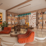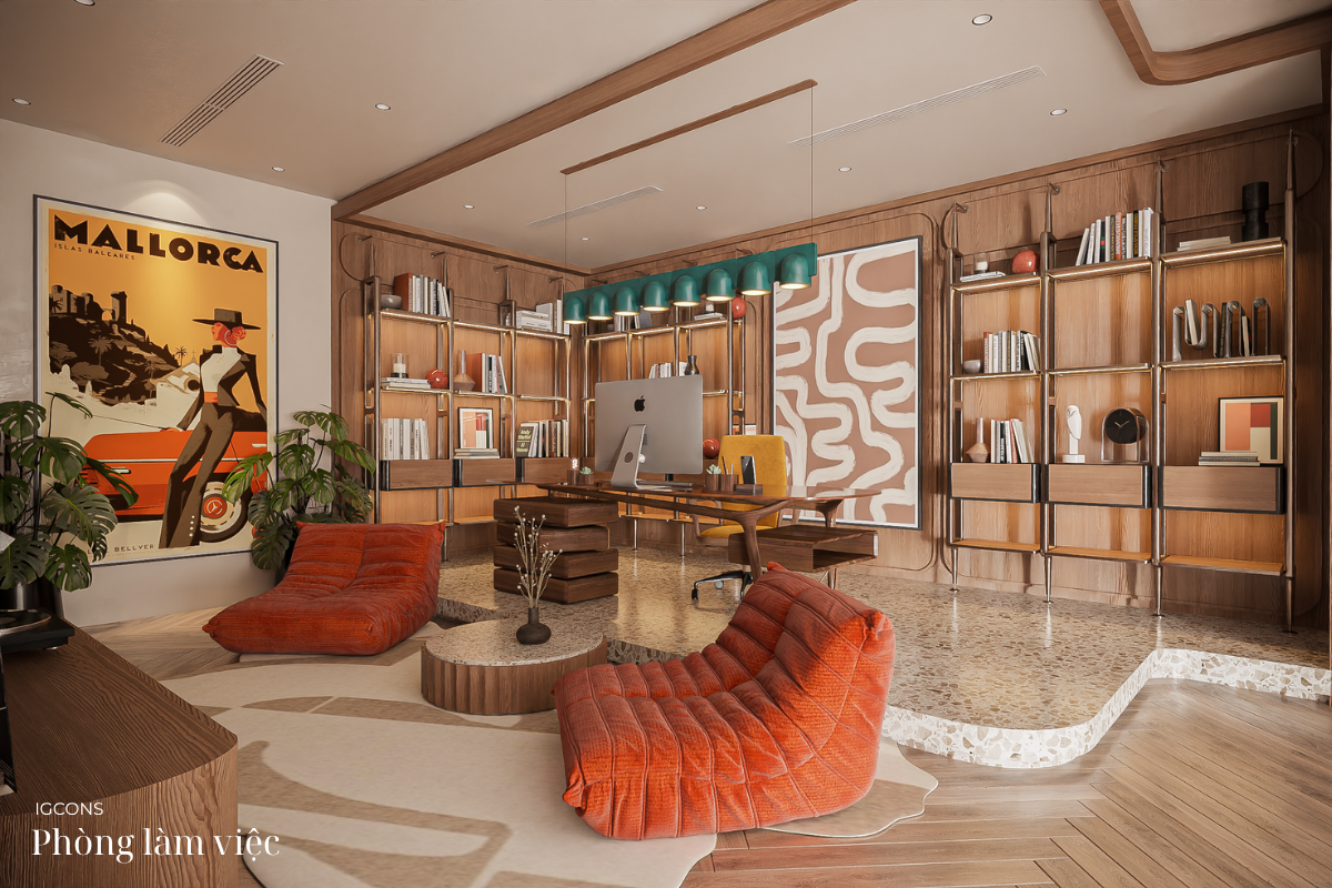 Thiết kế phòng làm việc phong cách retro độc đáo với kệ sách khung sắt công nghiệp, sofa cam vintage và tranh poster nghệ thuật, tạo không gian làm việc sáng tạo đầy cảm hứng