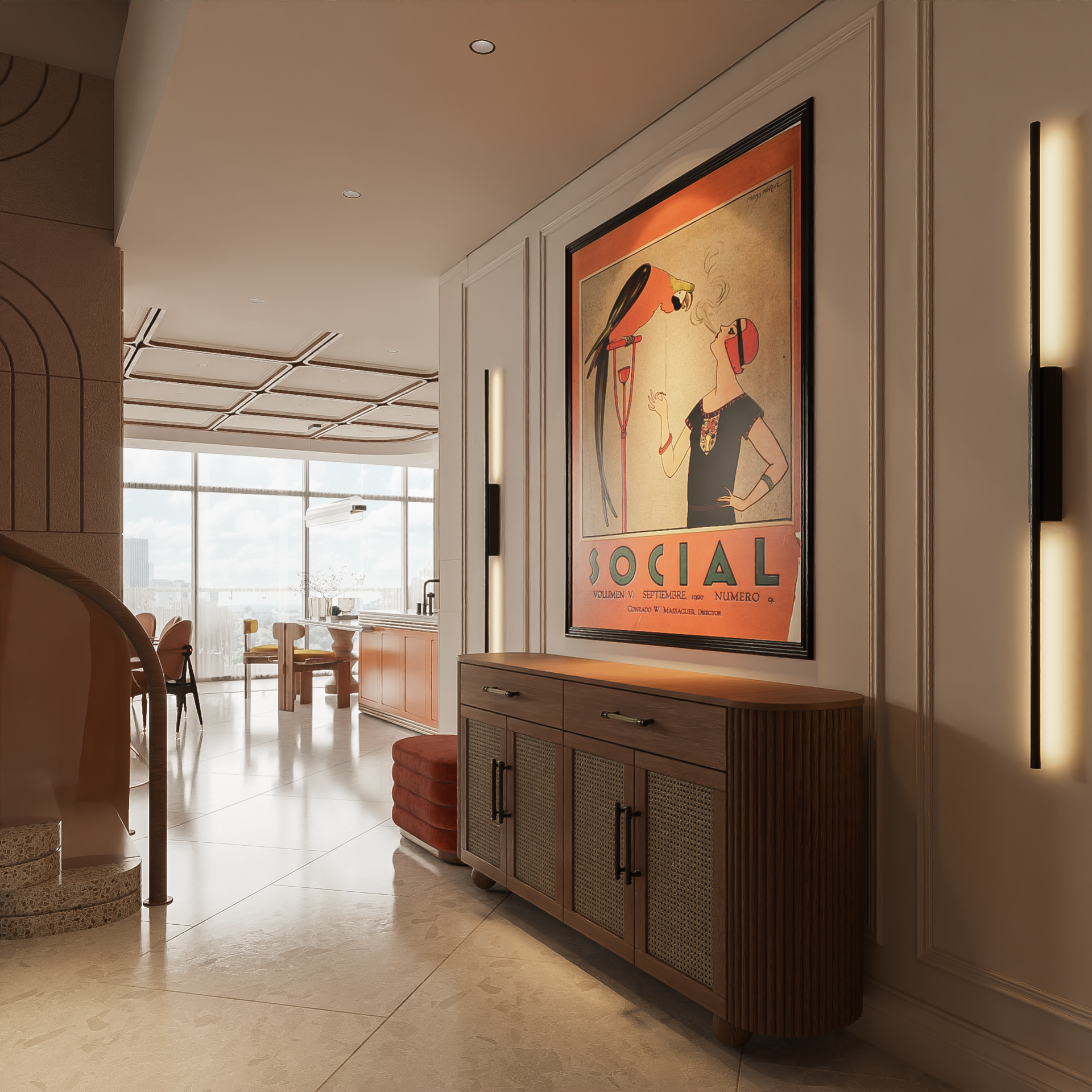 Một chốn dừng chân, nơi ánh sáng len lỏi qua từng ô cửa lớn, phản chiếu lên những gam màu ấm áp của gỗ, của nội thất Mid Century Modern đầy cá tính.