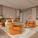 Thiết kế phòng ngủ master phong cách retro sang trọng với giường canopy bọc nhung vàng mù tạt, sofa cam vintage và tranh nghệ thuật độc đáo, tạo không gian nghỉ ngơi đẳng cấp và cá tính.