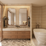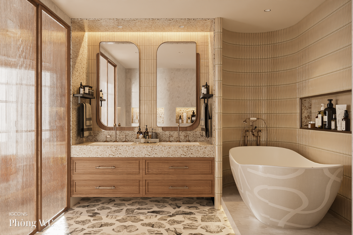 Thiết kế phòng tắm master sang trọng với bồn tắm độc lập, tủ lavabo đôi gỗ tự nhiên, đá terrazzo cao cấp và gạch ốp vân gỗ, tạo không gian thư giãn đẳng cấp resort tại nhà.