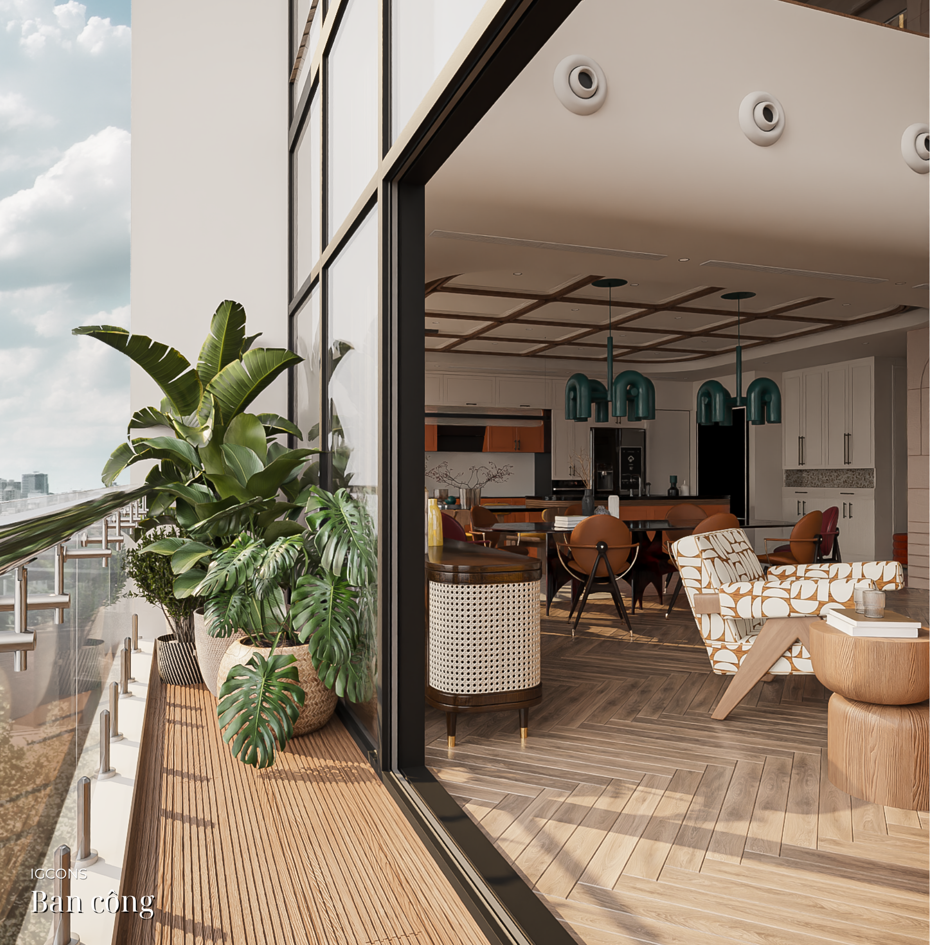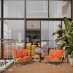Thiết kế ban công hiện đại phong cách retro với ghế bố khung sắt màu cam, cây xanh nhiệt đới và cửa kính khung đen tạo không gian thư giãn ngoài trời ấm cúng và phong cách