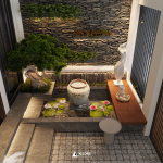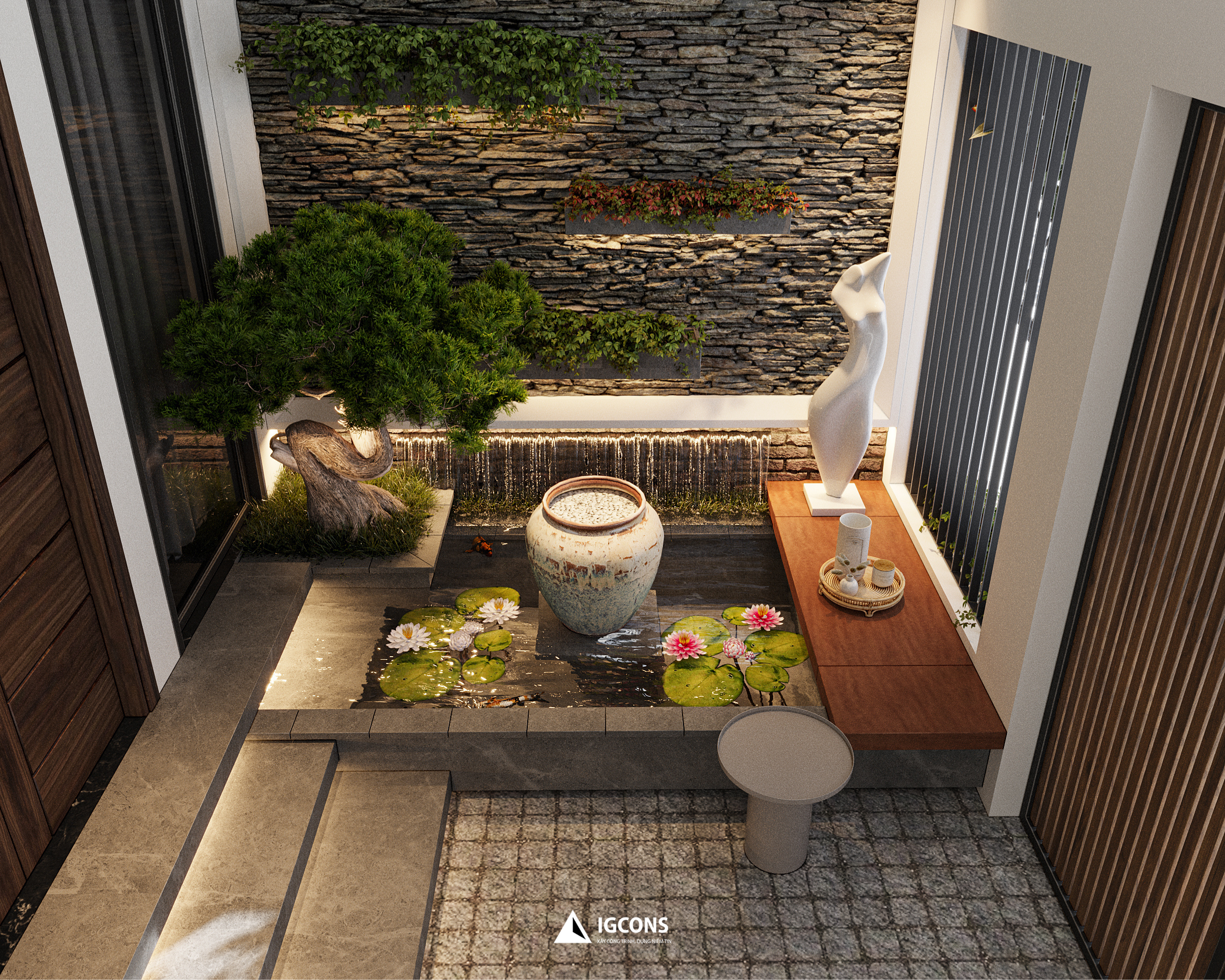 Thiết kế sân vườn hiện đại phong cách Nhật Bản với tường đá đen xếp tầng, tiểu cảnh bonsai, hồ nước mini và giếng trời cây xanh, tạo không gian thiền tịnh và gần gũi thiên nhiên ngay trong nhà.