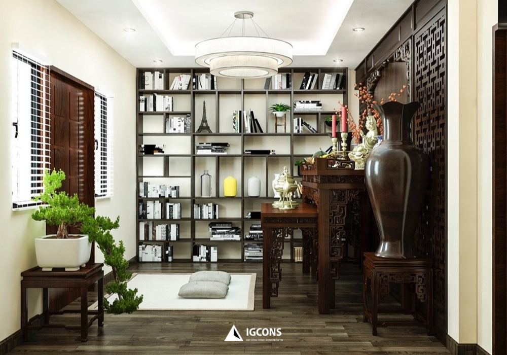 Phòng thờ được thiết kế theo phong cách truyền thống kết hợp hiện đại, giữ trọn sự trang nghiêm và tĩnh tại. Việc sử dụng nội thất gỗ, họa tiết Á Đông cùng hệ chiếu sáng nhẹ và kệ trưng bày tinh tế tạo nên không gian thờ cúng ấm cúng, chuẩn mực và giàu chiều sâu văn hóa.